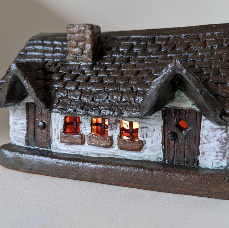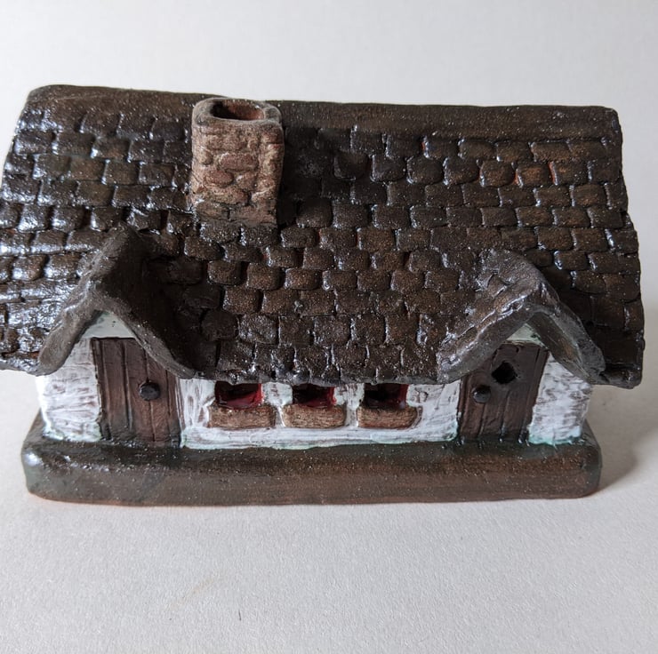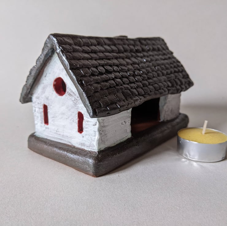 Slate Roof Long Cottage Tealight Holder. All items are made from scratch. I draw and plan each building then cut the pieces out of clay. I add textures and details then build them. Once they are assembled I decorate them with coloured clays and oxides before the bisque firing then they are glazed and fired once more. Every little building is unique.