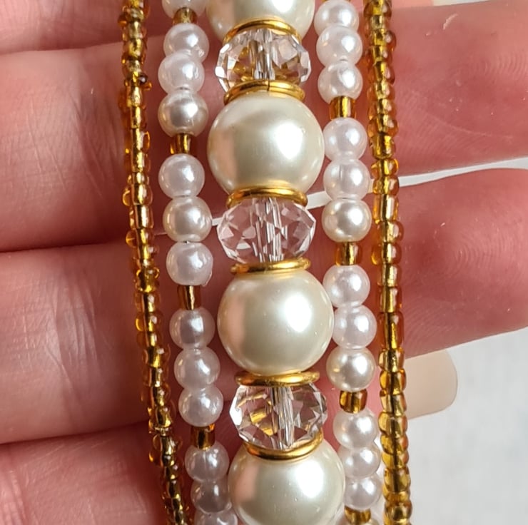 A lovely wire wrap bracelet with White, Ivory and Gold tone glass beads. A large Wrap style bracelet with 5 strands of various glass pearls and beads.