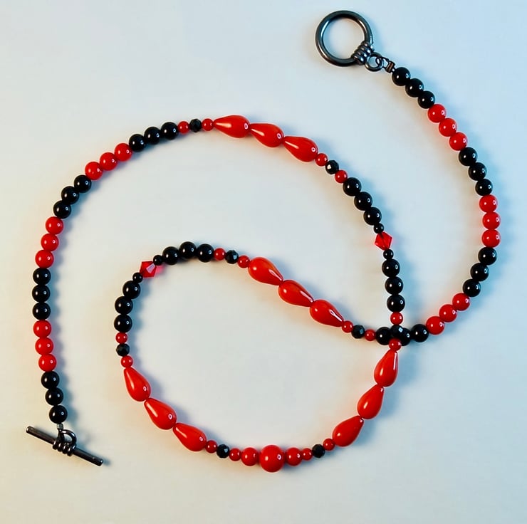The 4mm Black Onyx beads add a lovely contrast to the postbox red of the coral.