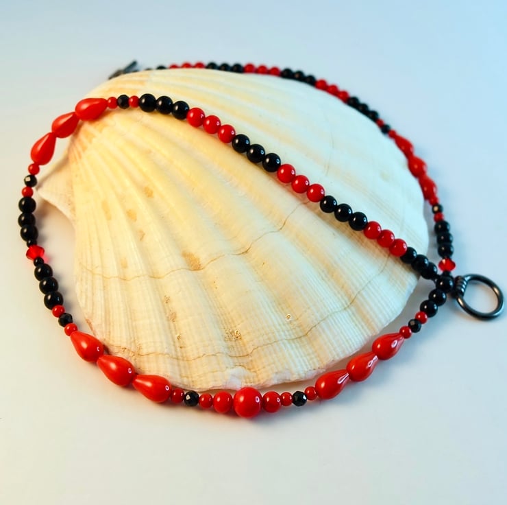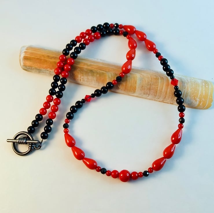 The 4mm Black Onyx beads add a lovely contrast to the postbox red of the coral.
