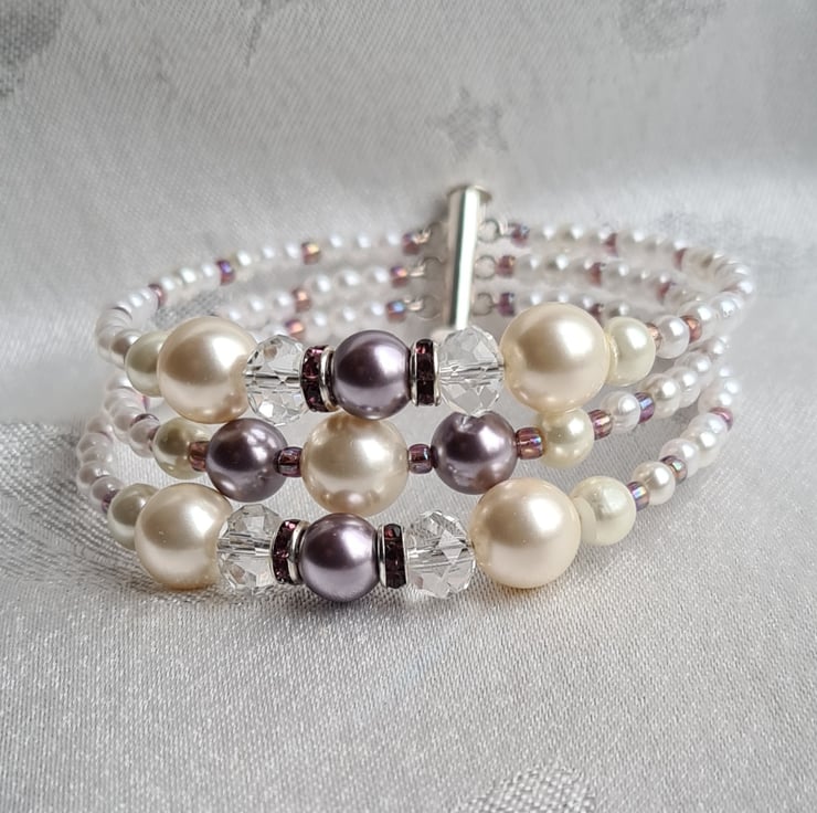 A gorgeous triple strand bracelet with glass beads and sliding clasp. The glass pearl beads are shades of White, Ivory and Purple, with faceted crystal beads and glass seed beads in Amethyst tones.