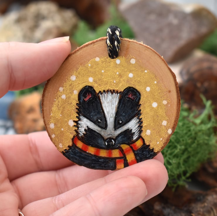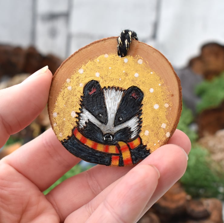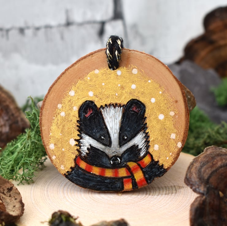 A beautiful dinky wood burned decoration for the home with a festive theme! This one has a cute badger with a scarf. Decorated with gold paint, and art pencils.