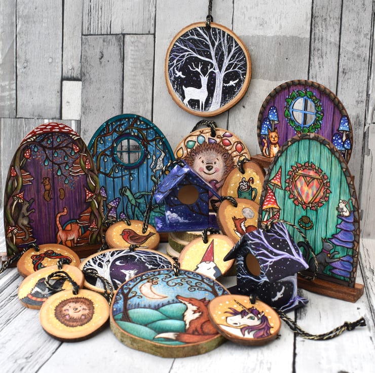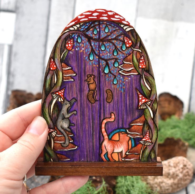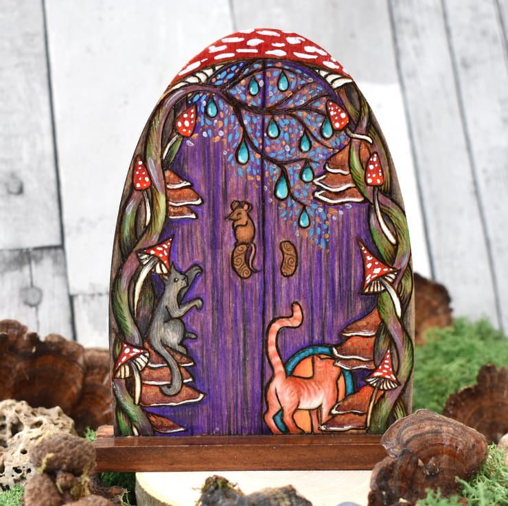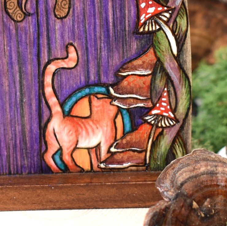 A unique lightweight fairy door, burned using pyrography with a feline and fungi theme. Decorated with paint and art pencils.