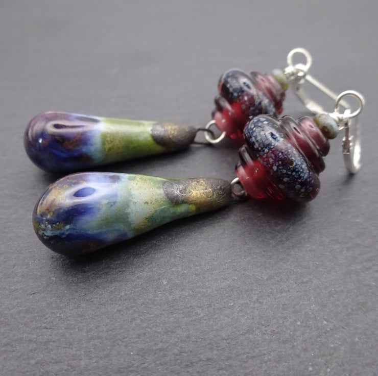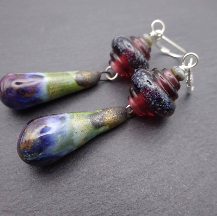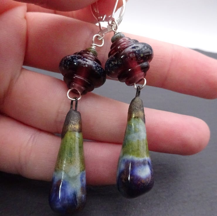 A pair of earrings with sterling silver lever back ear wires, handmade lampwork glass beads and handmade ceramic drops with a green and purple glaze.