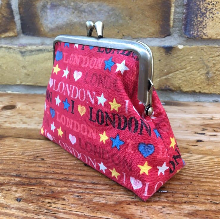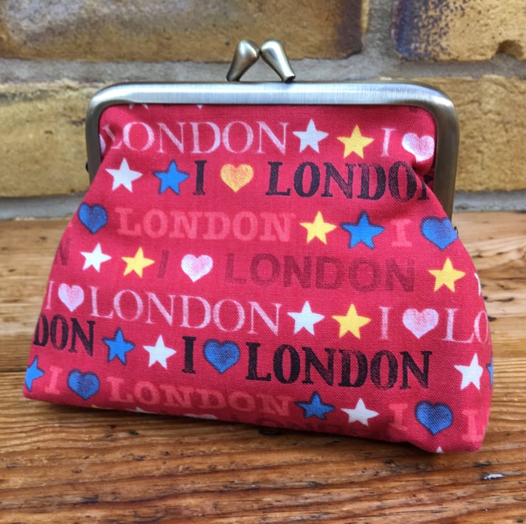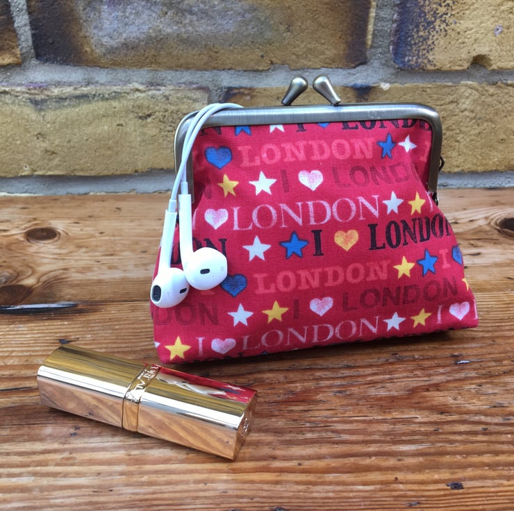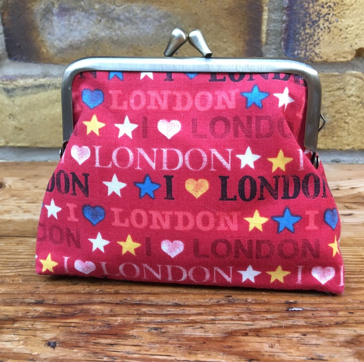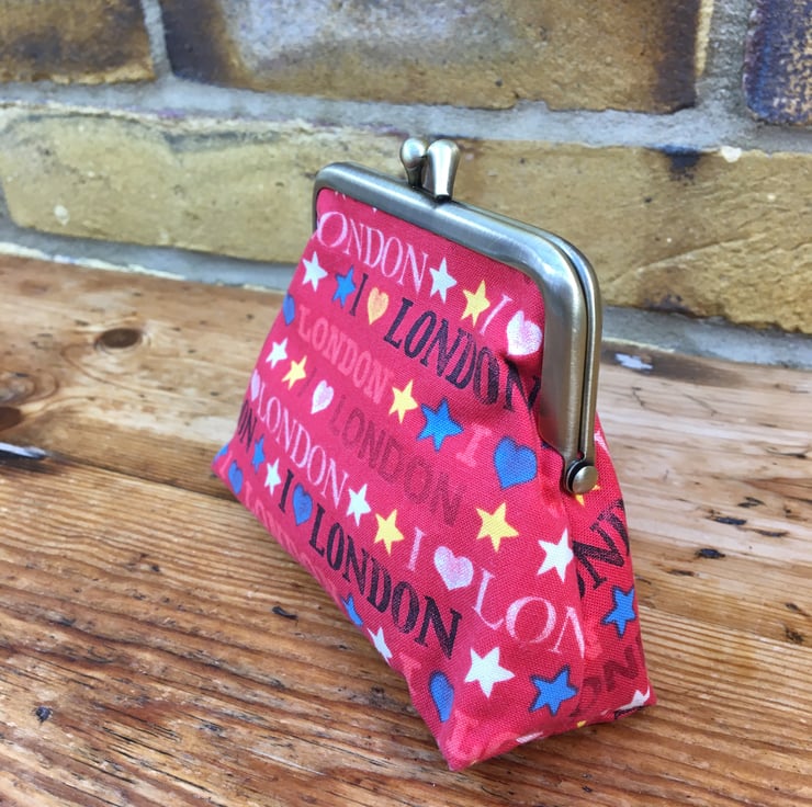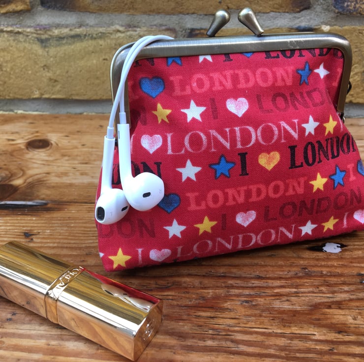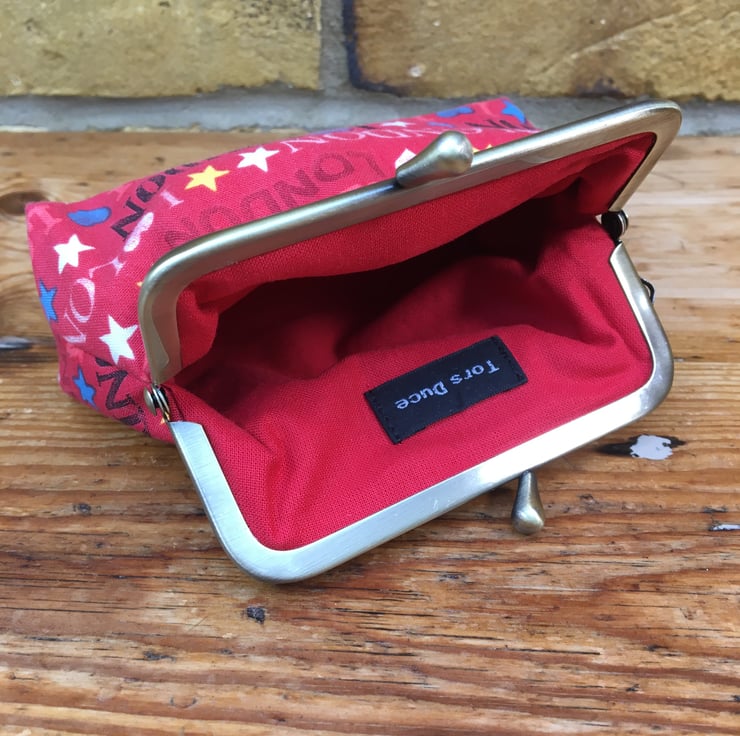 Red coin purse, Metal frame purse, Love London fabric, Handbag tidy