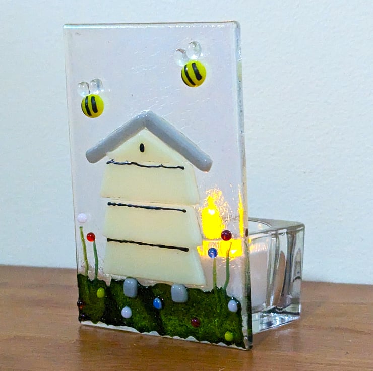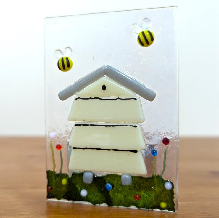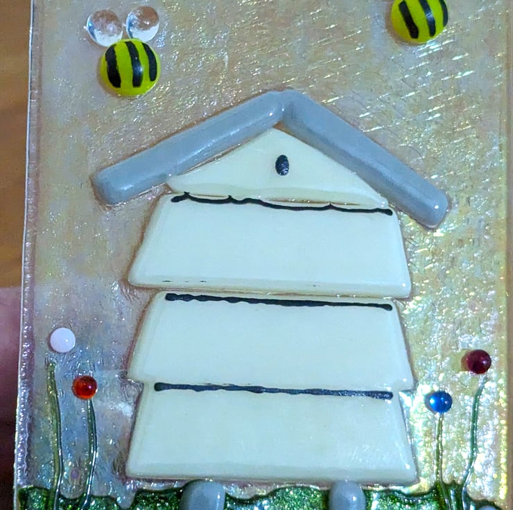 The front fused glass panel is made from Rainbow Iridescent Clear glass with coloured glass beehive, coloured glass elements then mounted onto a clear glass holder