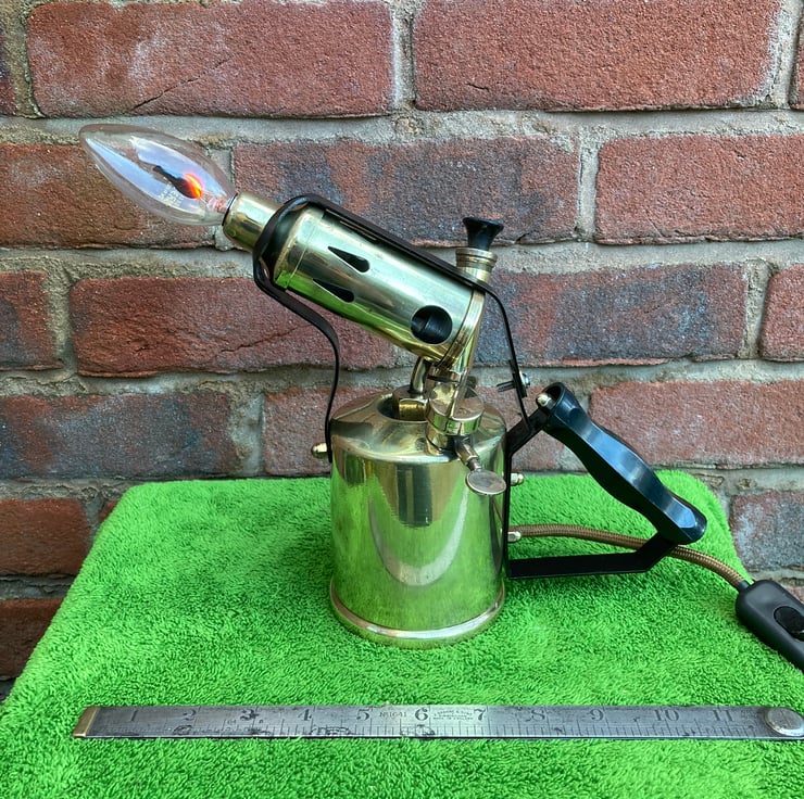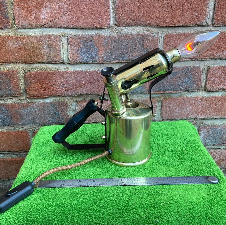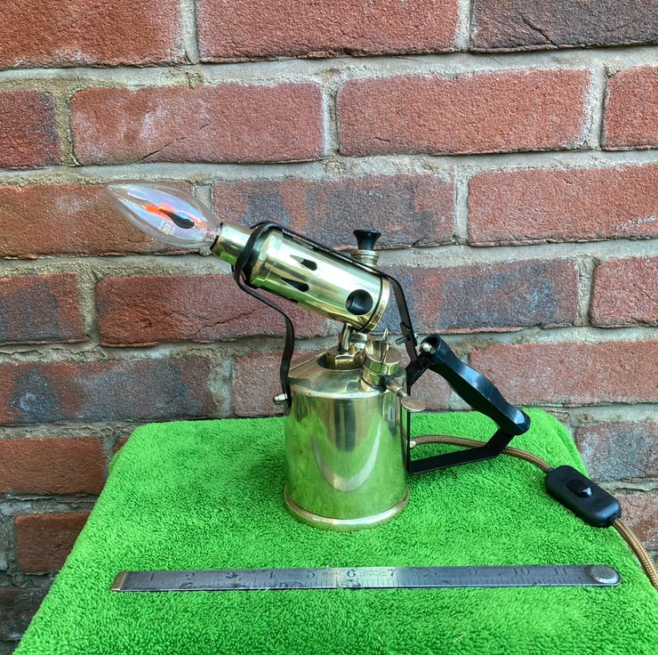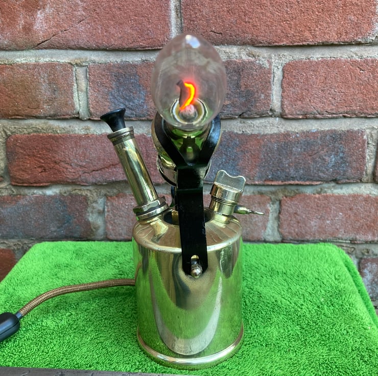 Old brass blowlamps sit corroding and unused in so many sheds, a good polish and sympathetic professional, conversion with a flame effect bulb makes them into desirable decorative lighting