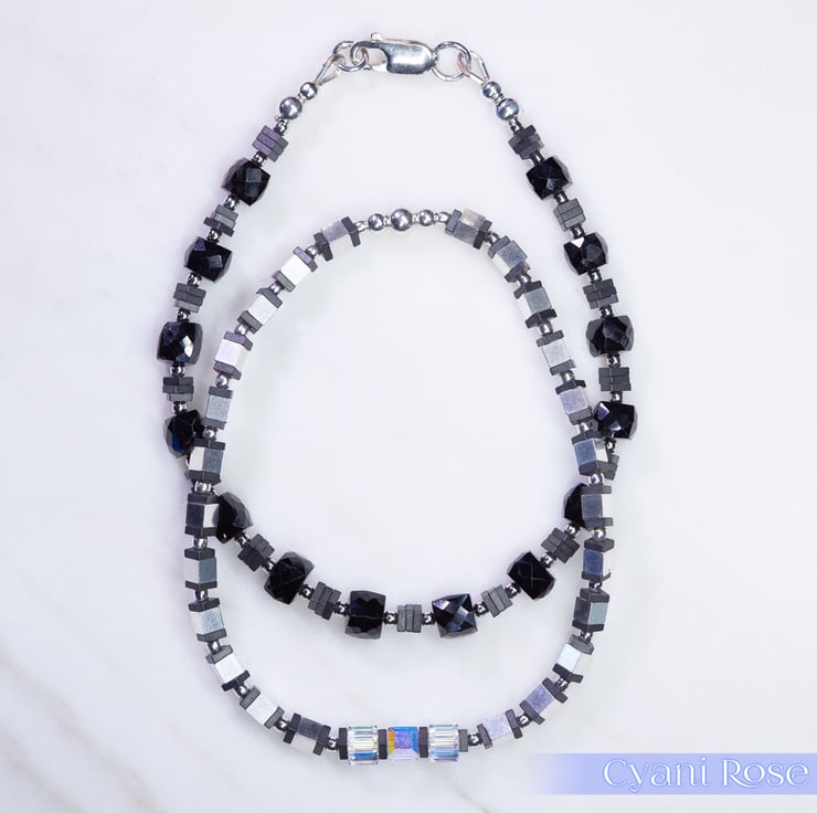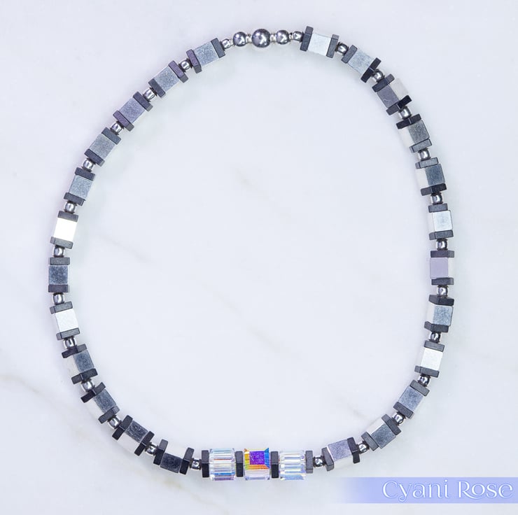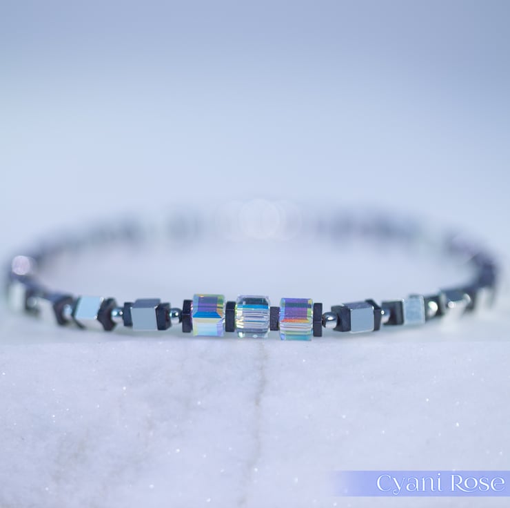 We have made this bracelet using sterling silver 4mm cubes and 2mm beads, hematite flat beads and 4mm Swarovski AB coated cubes. The AB coating gives a really pretty rainbow sheen to the beads.