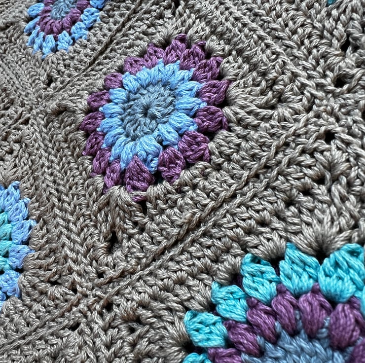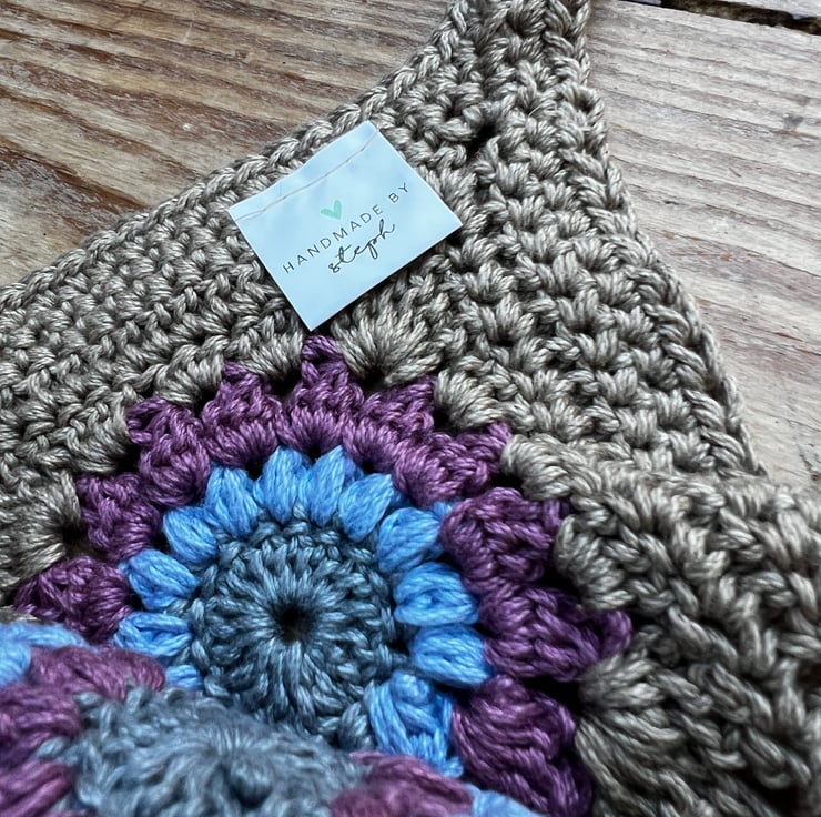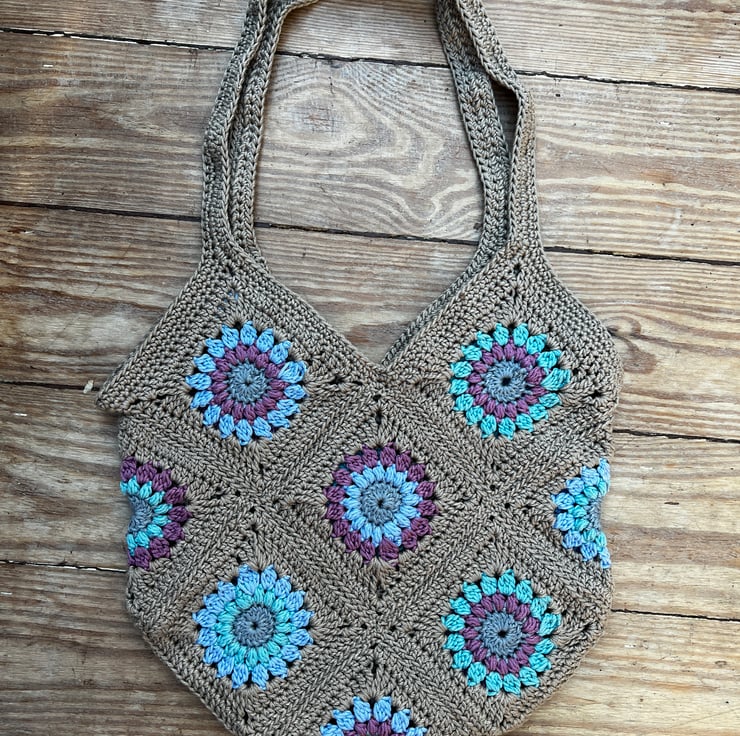 Handmade crochet bag, with cotton yarn, vintage boho granny squares and two straps. Main colour is Latte with multi coloured flowers. Made in Dorset, UK. With label saying handmade by Steph.