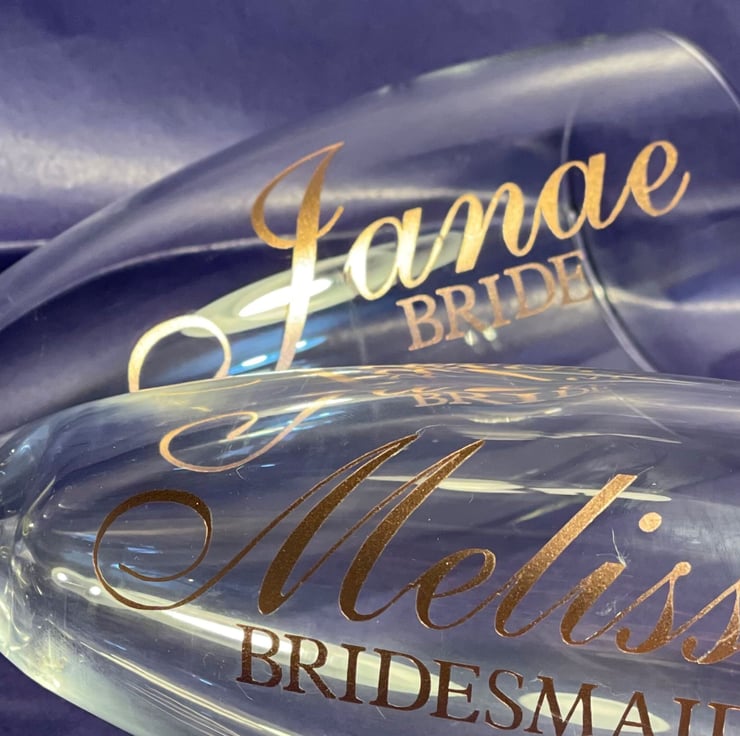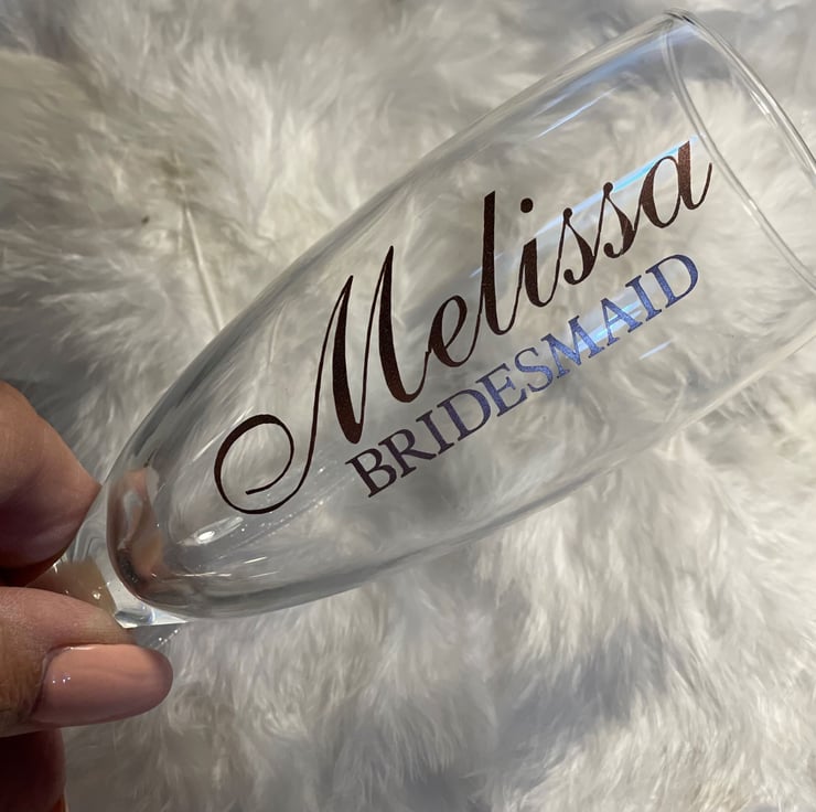 personalised permanent vinyl decals for champagne fluteswine glassespint glasses for all members of your bridal party
