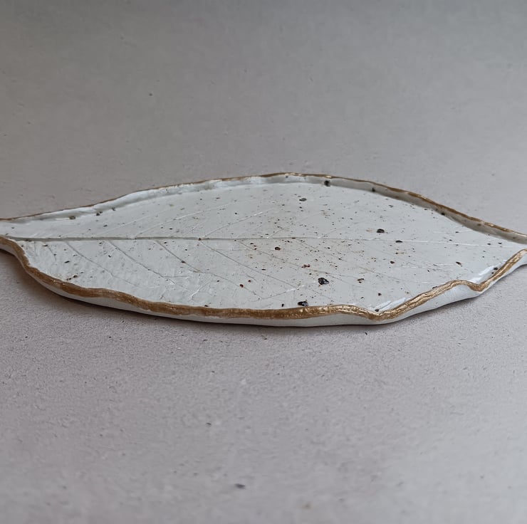 Beautifully rustic and imperfect, leaf shaped dish, with real leaf impression inside. Irregular and organic looking sides. Made with clay and speckled to give a stone effect, then casually painted with a dull gold on its rim. Glossed for shine and elegance.