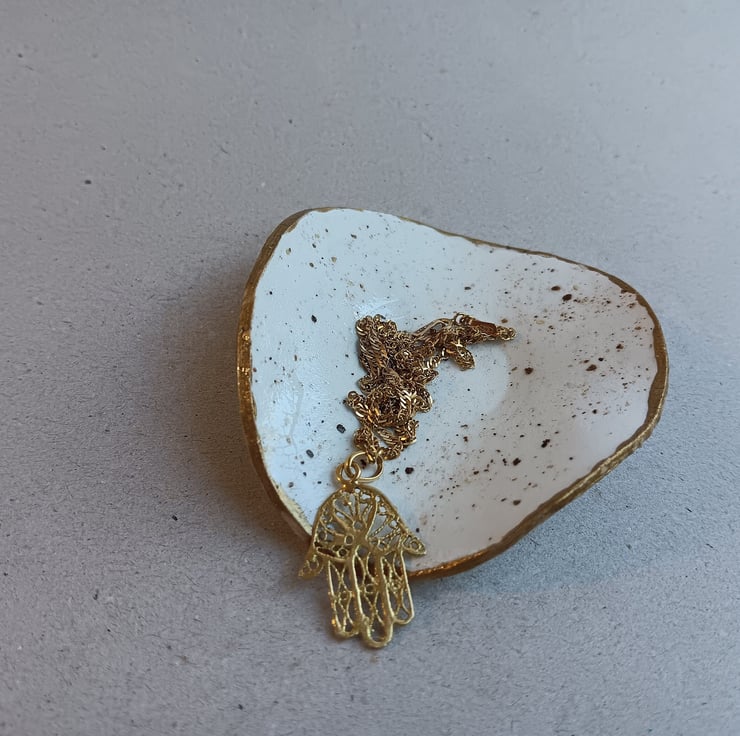 Beautifully rustic and imperfect, a tiny circular dish with irregular sides. Made with clay and speckled with pepper to give a stone effect, then casually painted with a dull gold on its rim. Glossed for shine.