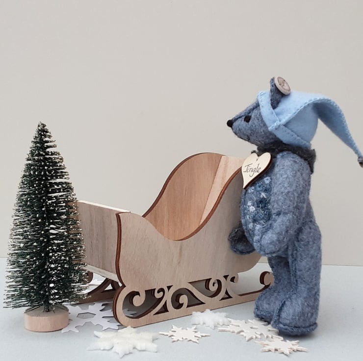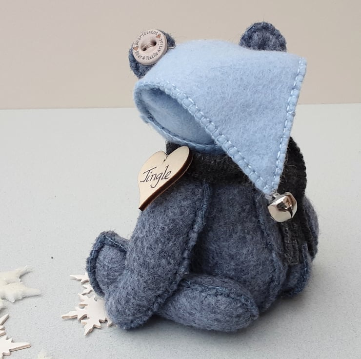 Jingle is a cheerful teddy bear who loves to spread Christmas cheer, he wears a removable elf hat in powder blue with hand embroidery to the front and finished with a little silver bell.