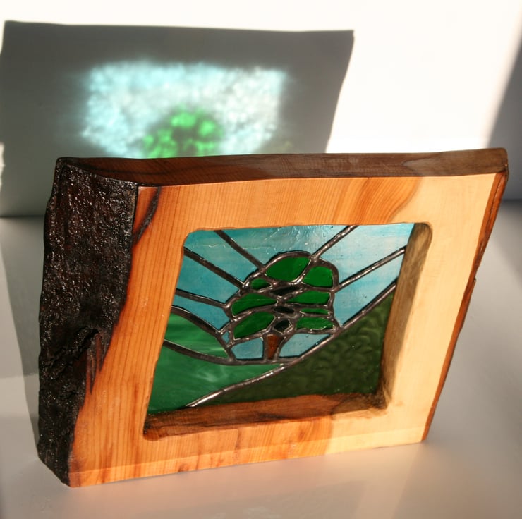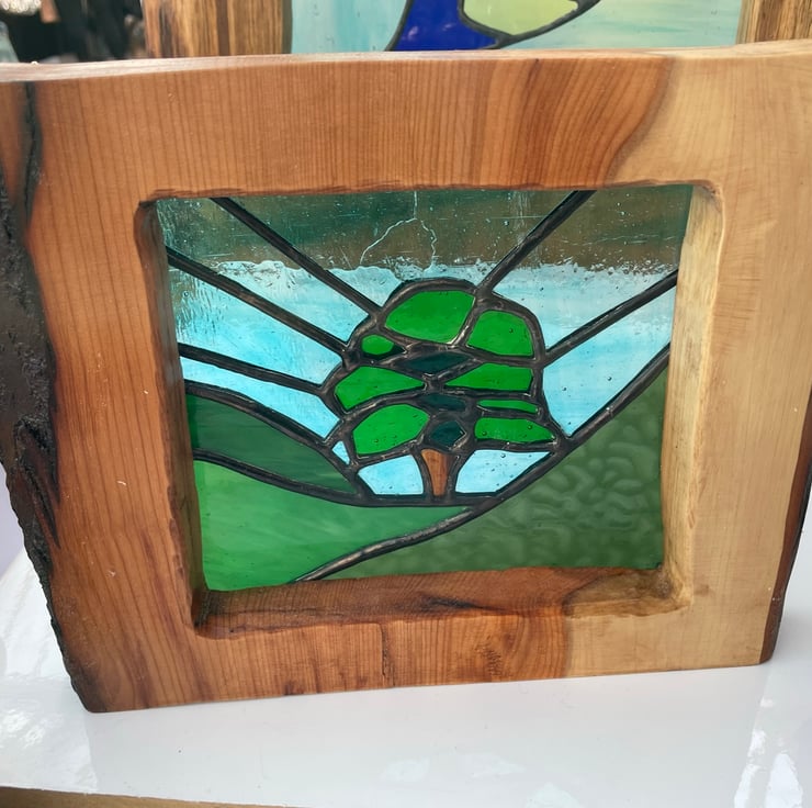 A stunning piece of stained glass frames in a solid Yew frame. It depicts the famous Sycamore Gap in Northumberland. The iconic image of the sycamore tree lives on and has been that special place for the many visitors who want to capture this magical place.