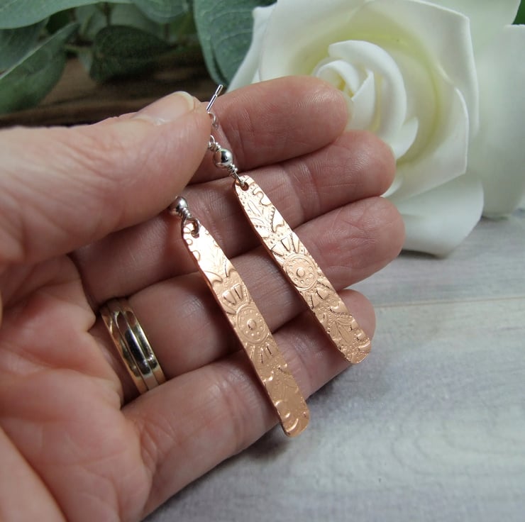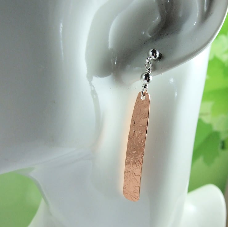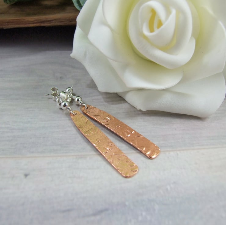 I have created the bar shapes from copper wire and textured it with a lace pattern in my rolling mill. To these I have added sterling silver ear wires and some 3mm silver beads. All fittings are sterling silver.