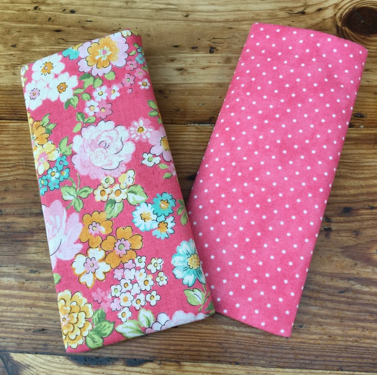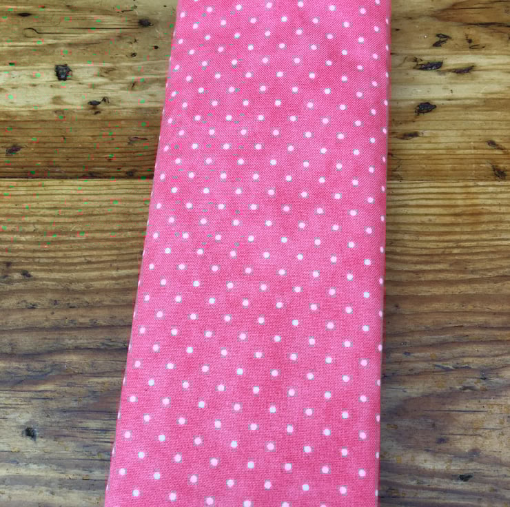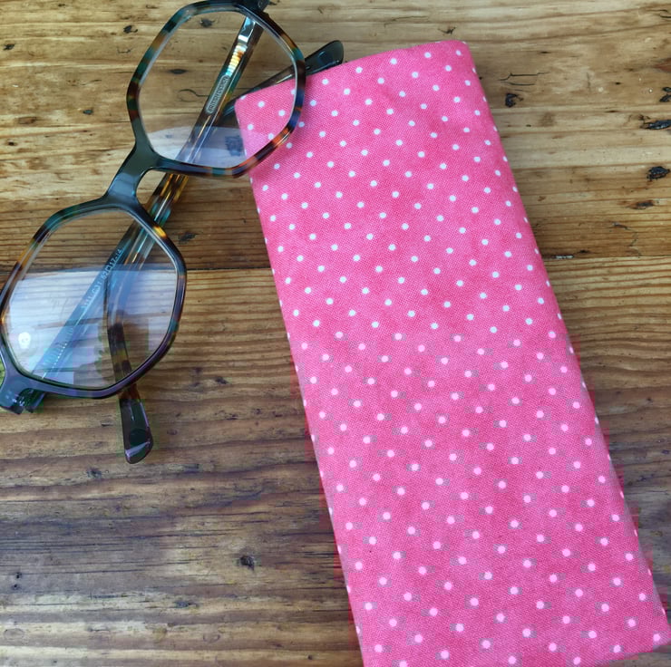 A fun and stylish premium quality pink spotted cotton glasses case. Stiffened with Vilene and lined with soft pink felt to keep your glasses protected.