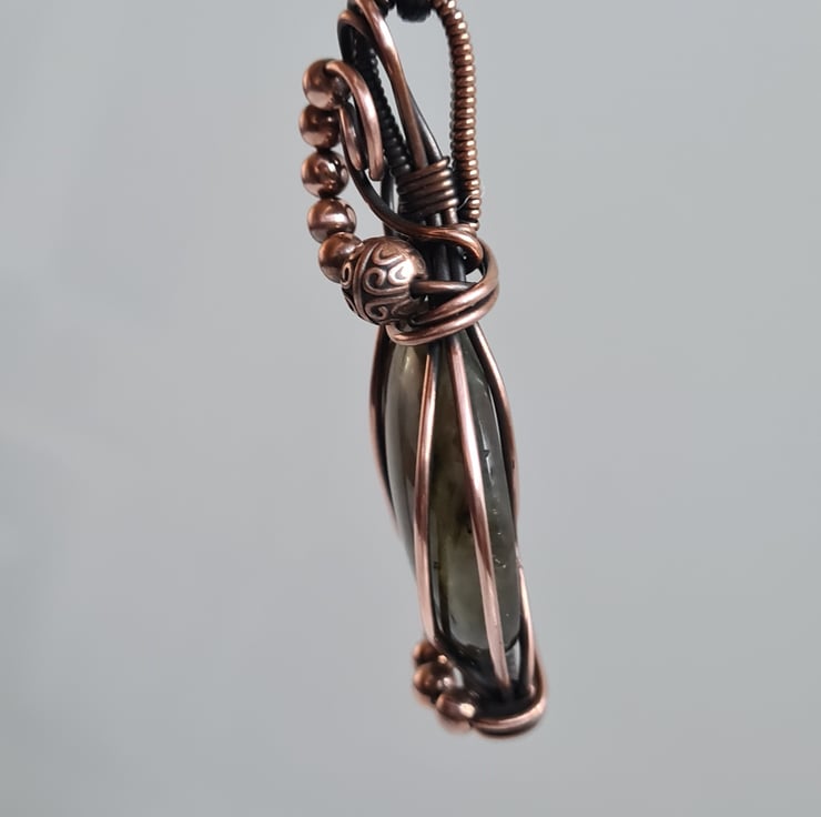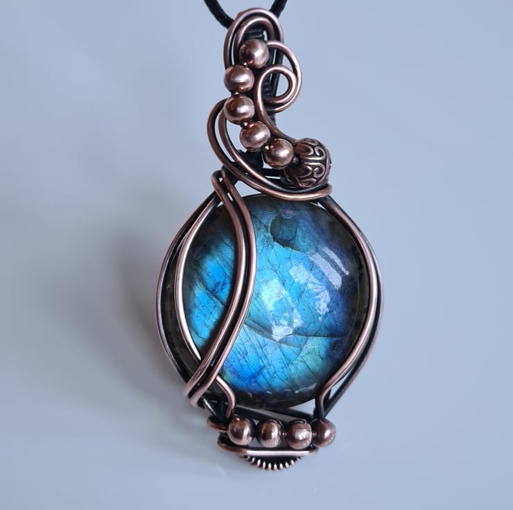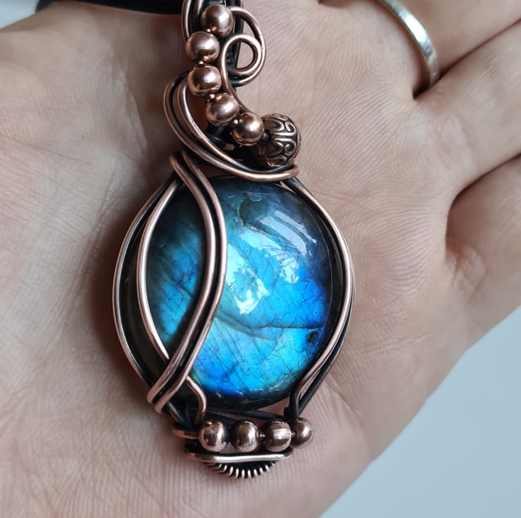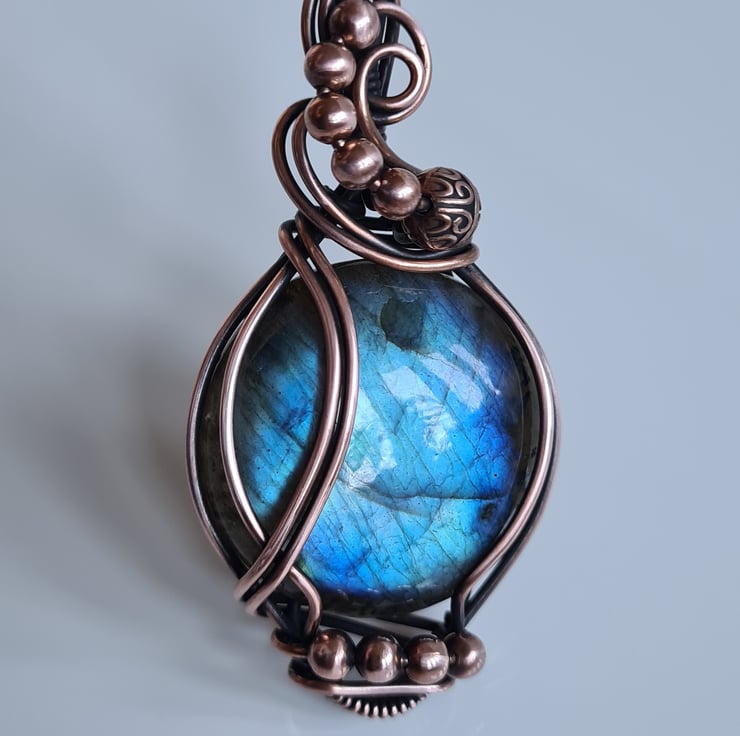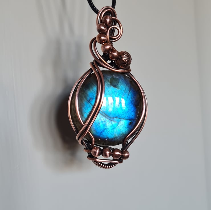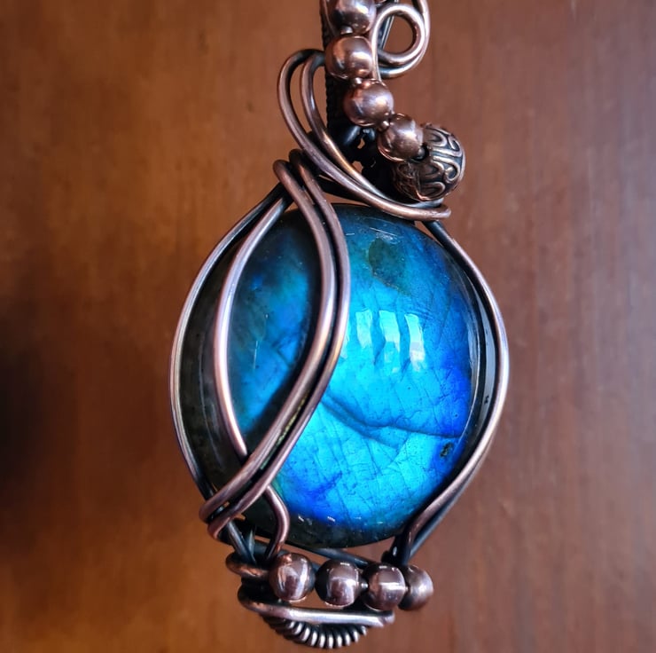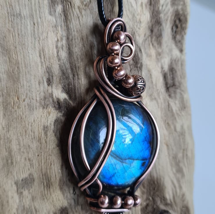 This lovely Natural Labradorite crystal is a beautiful flashy deep blue and I have wrapped it in copper and then antiqued and polished for the final effect. Finishing with copper beads. This labradorite has a lovely energy and feel to it, looks amazing against the copper, and is a ideal unique, one of a kind gift.