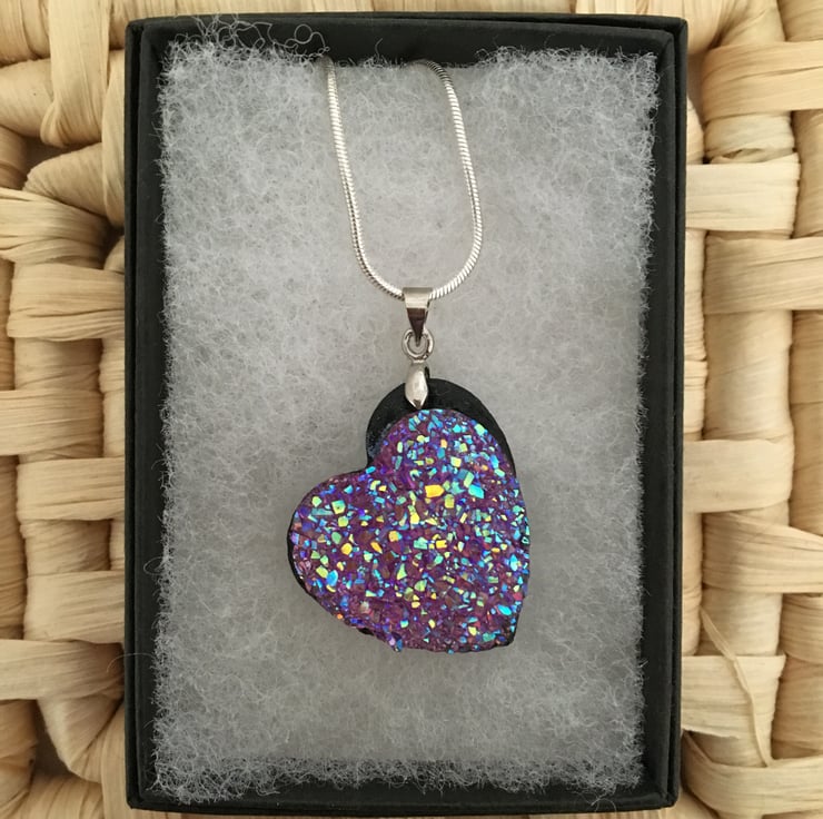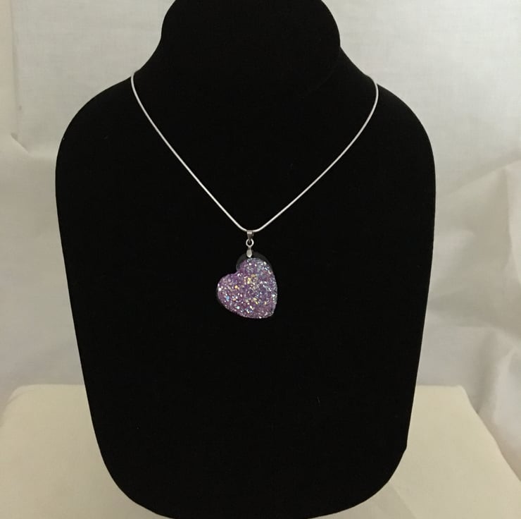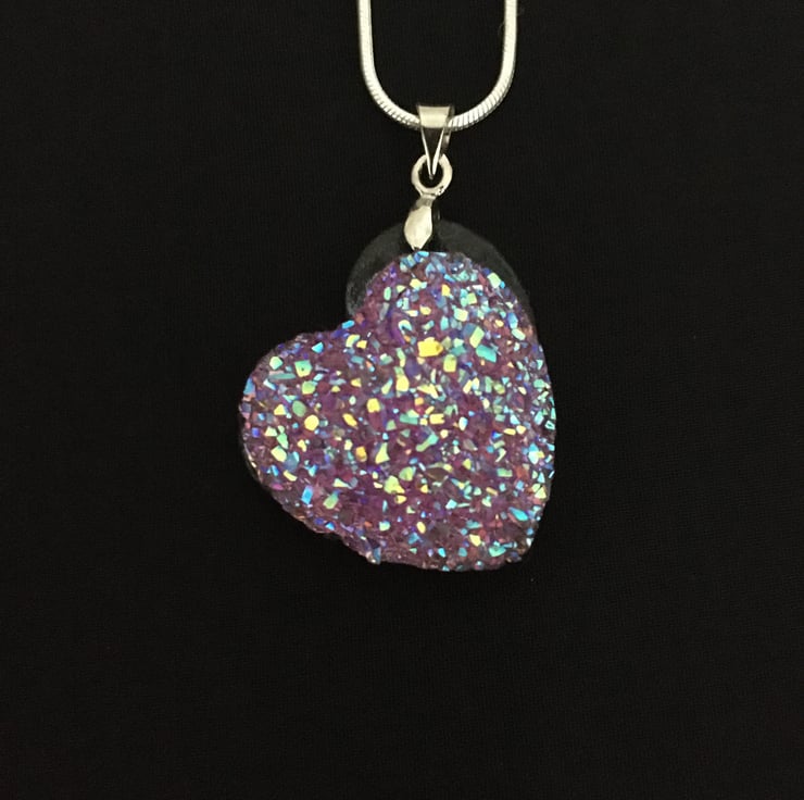 Glittering heart pendant with a resin druzy cabochon centre set in a polymer clay base. The particles mixed in the resin reflect the light and really bring the sparkling colours to life.