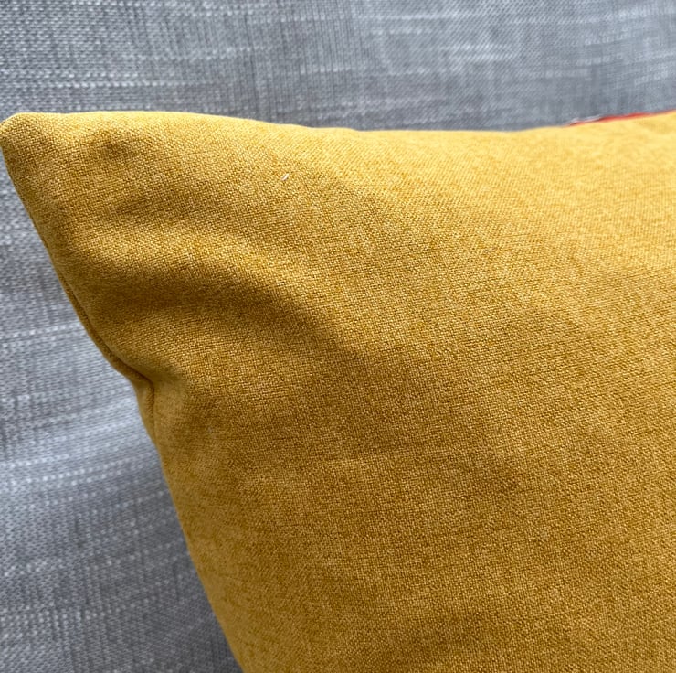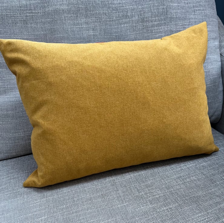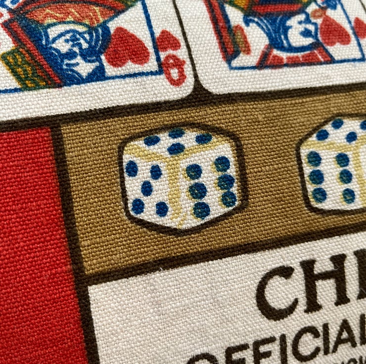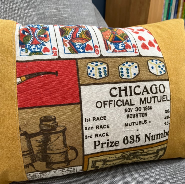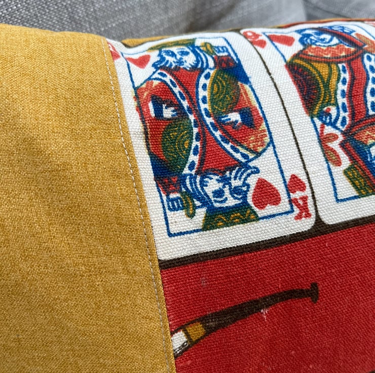 One of a kind cushion cover featuring reclaimed vintage linen by Greef called Minor Vices. The print has images of playing cards, dice, liquor, and race cards. I’ve combined it with a mustard fabric with a soft brushed feel.