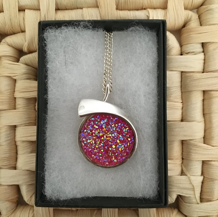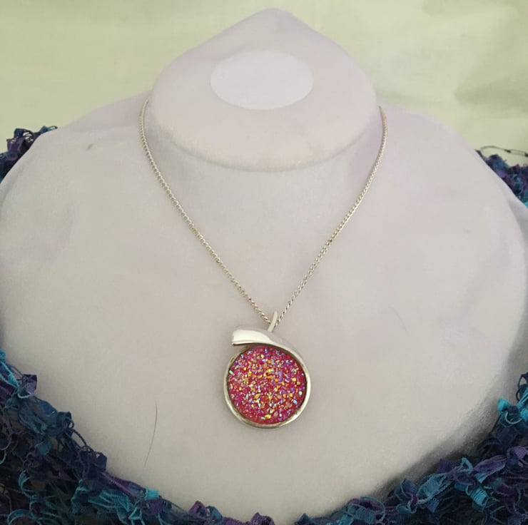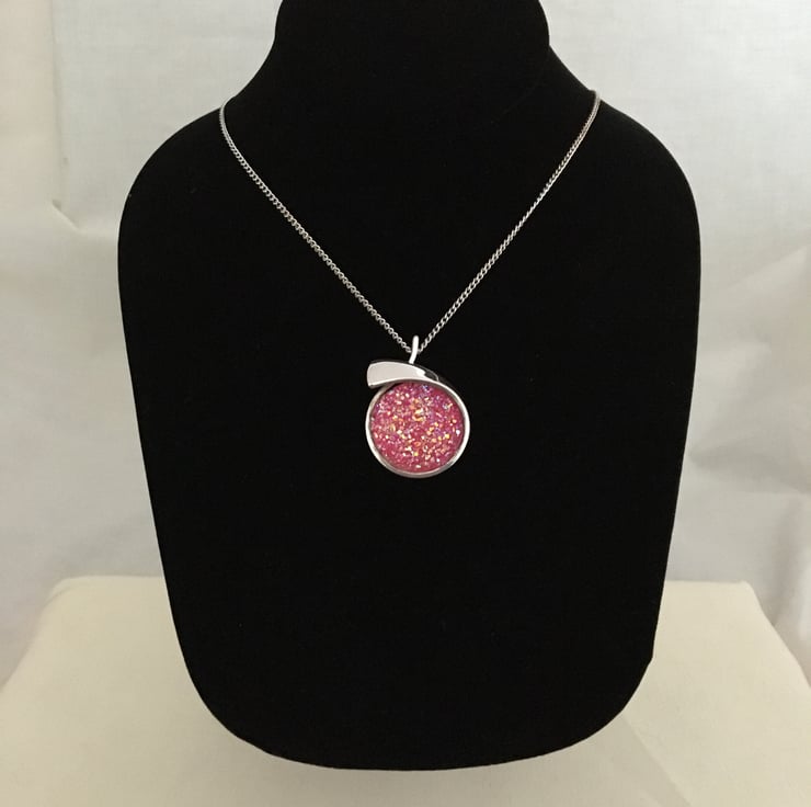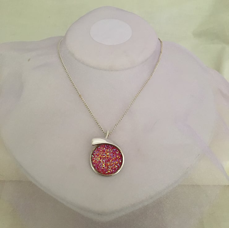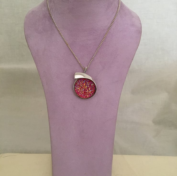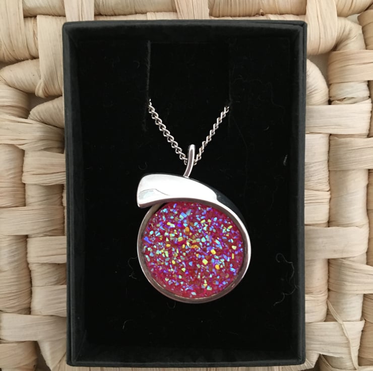 Glittering pendant with a resin druzy centre in a crossover setting. The particles mixed in the resin reflect the light and really bring the sparkling colours to life. Because the surface of the druzy stone is created using tiny pieces of resin it does not have a smooth surface.