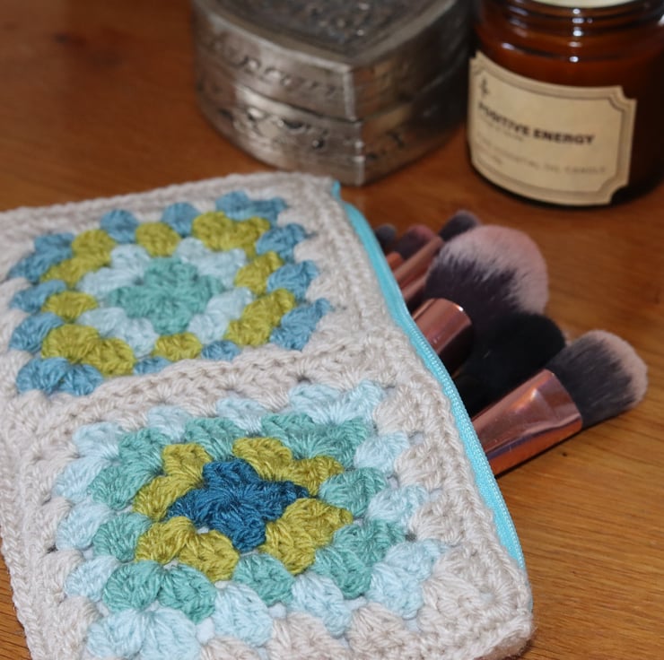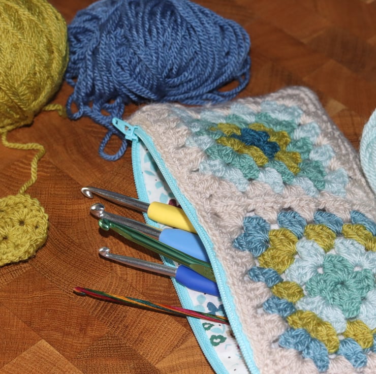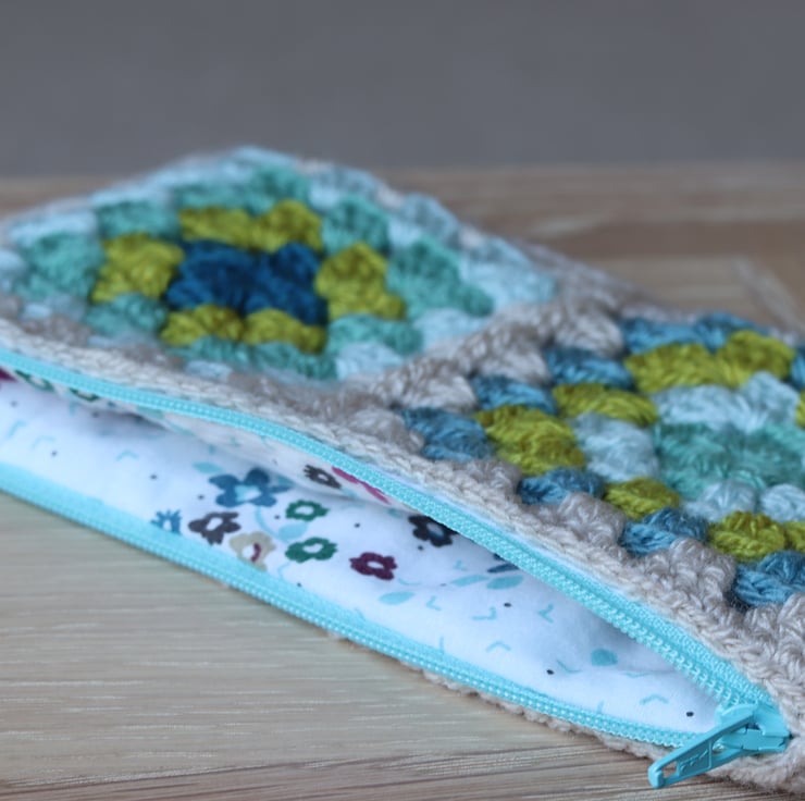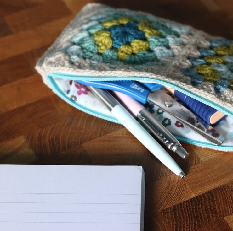 A simple but versatile granny square pencil case, lined with a vintage, repurposed cotton fabric.
