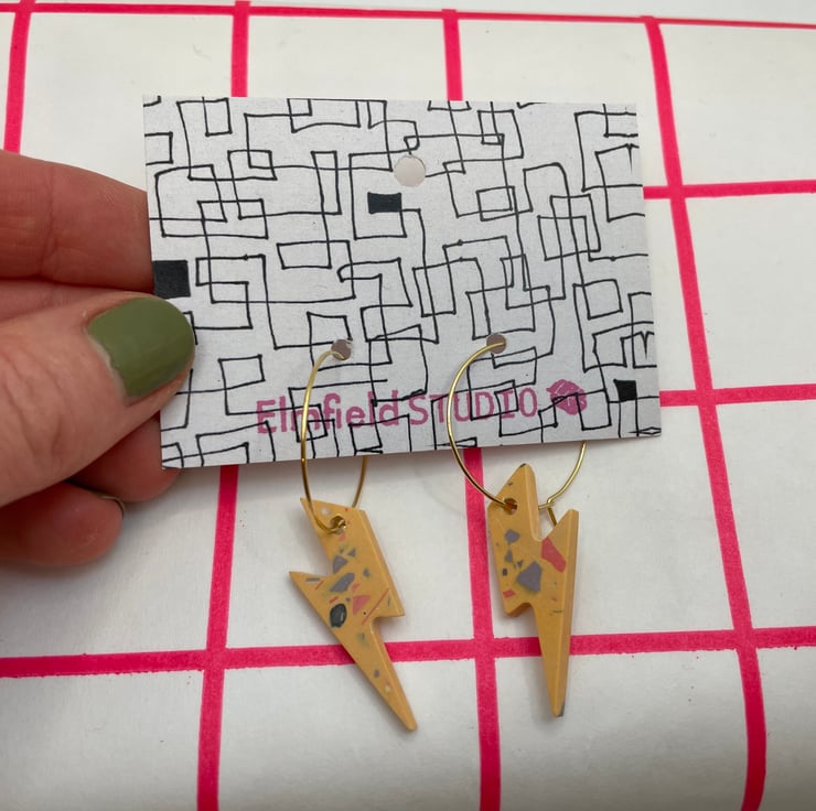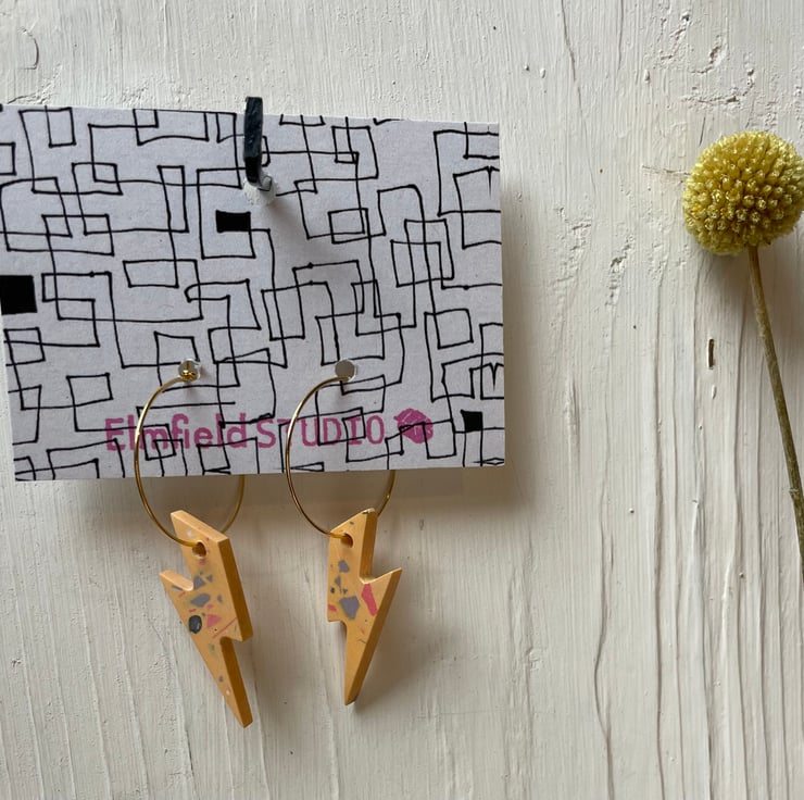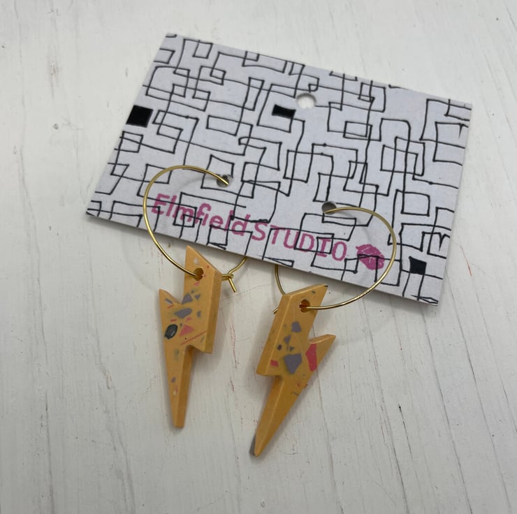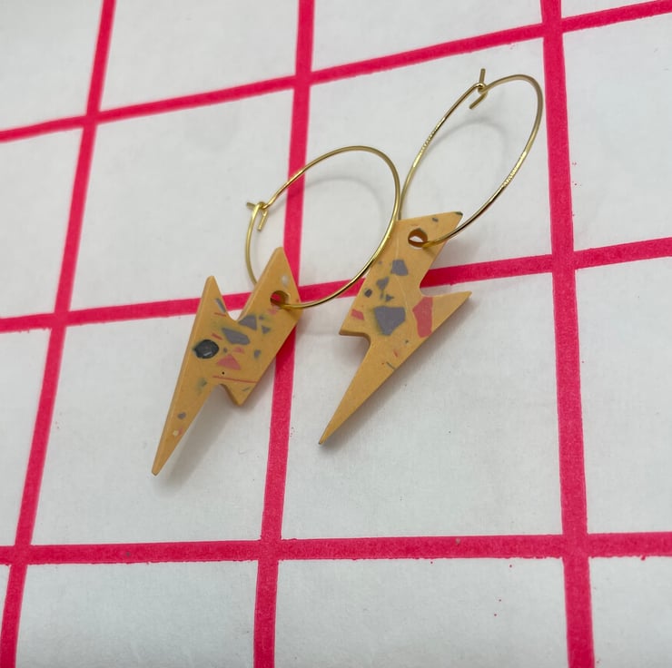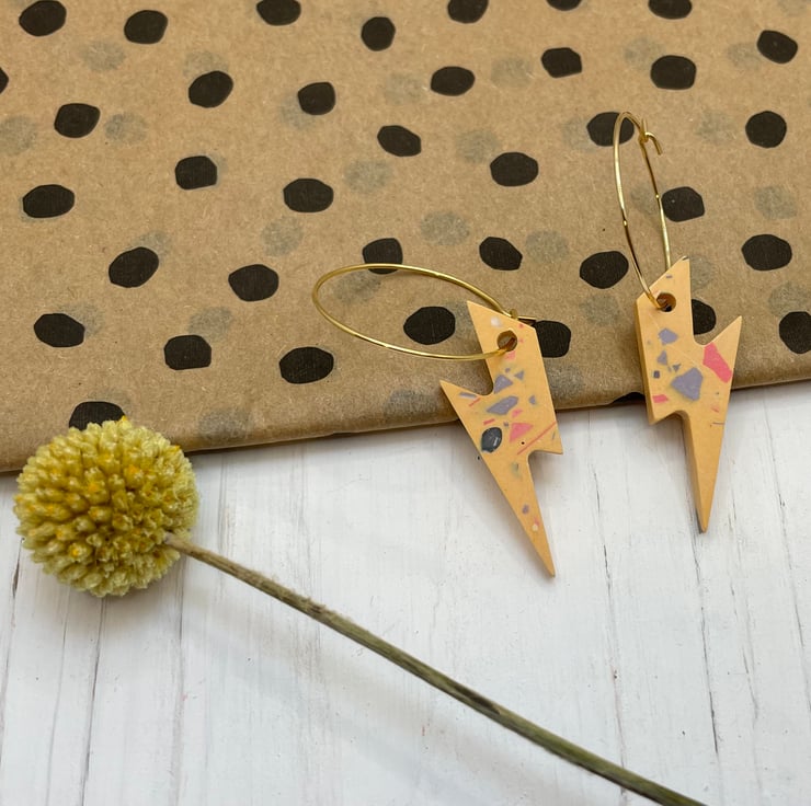 Cute lightning bolts cast in orange Jesmonite with coloured terrazzo finished on a gold plated 20mm hook latch hoop.