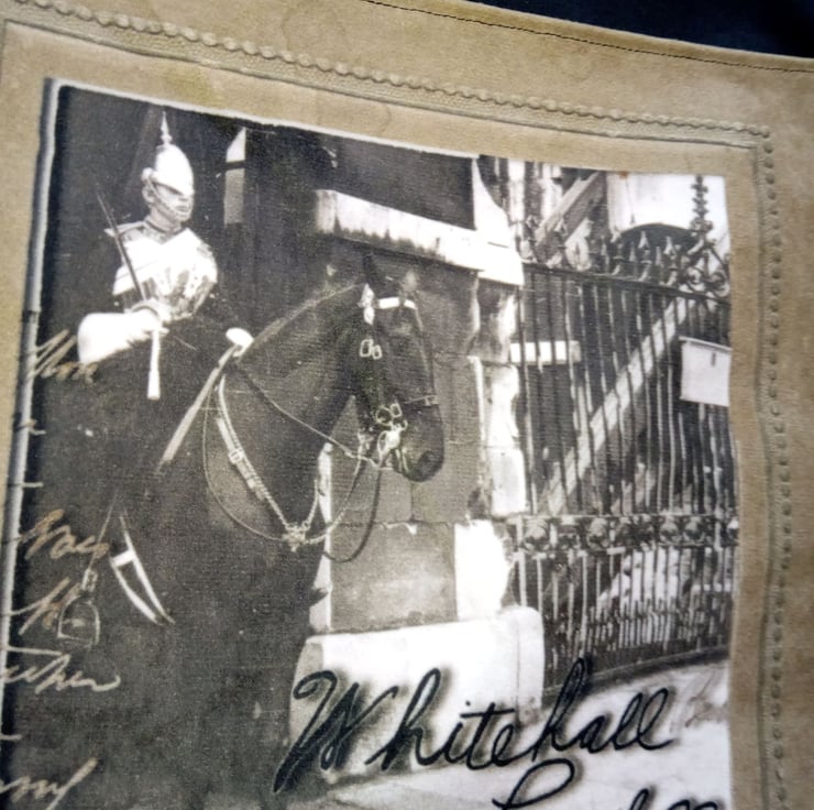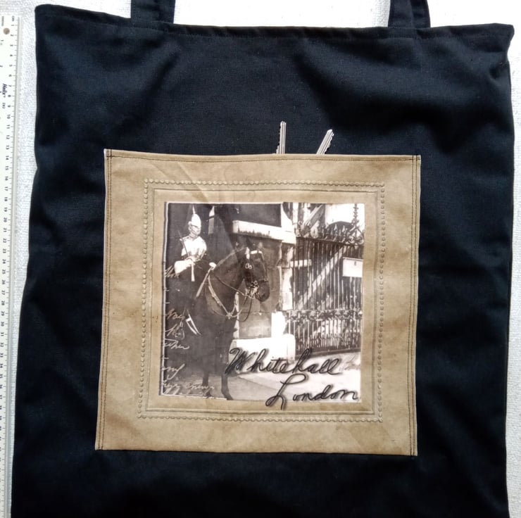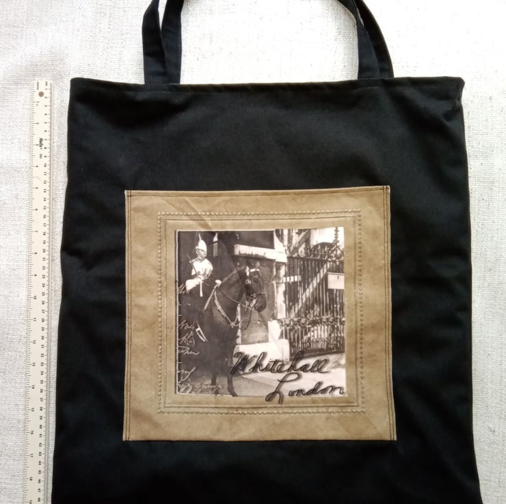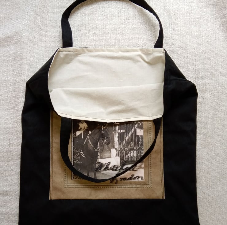 This one of a kind tote bag measures 48cmx 46cm with an outer pocket measuring 28x28cm. The main black bag is made of hard wearing canvas with a calico lining, the pocket is perfect to pop your phone and keys in to, it has a velvet feel and features an image I have created and had professionally printed, of a Whitehall soldier on horseback. The handles measure 47cm and have been stitched on to the bag multiple times.