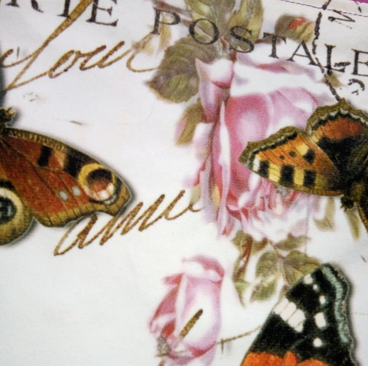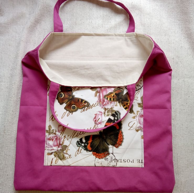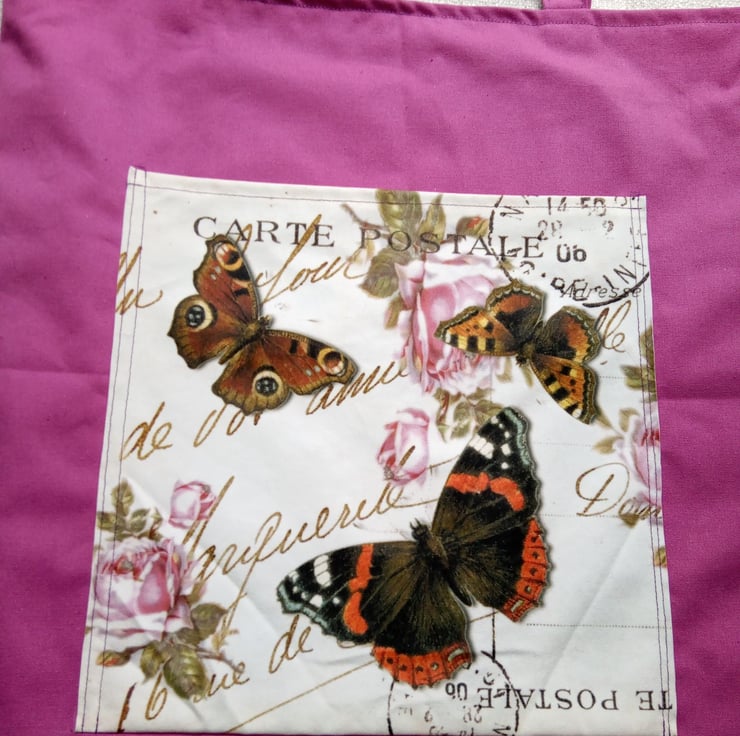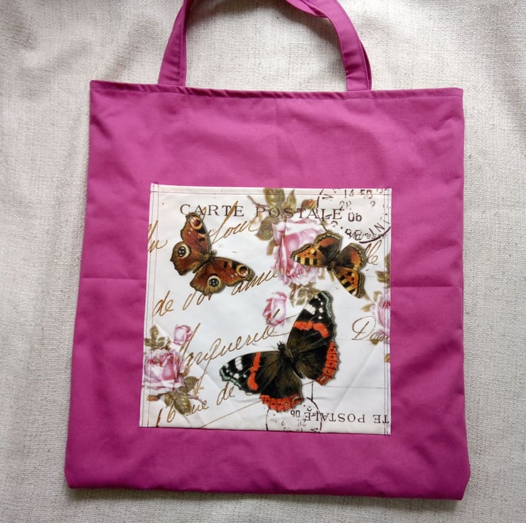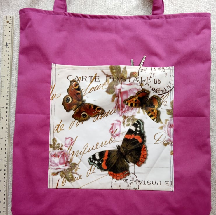This one of a kind tote bag measures 48cmx 47cm with an outer pocket measuring 27x29cm. The main bag is made of a vibrant pink hard wearing canvas with a calico lining, the pocket has a velvet feel and features an image I have created using text from an old postcard and Victorian butterfly illustrations. The handles measure 45cm which have been sewn on with multiple layers of stitching. Perfect to pop your keys and phone in to so they are close to hand.