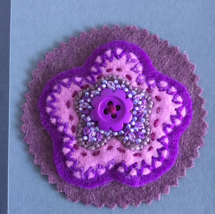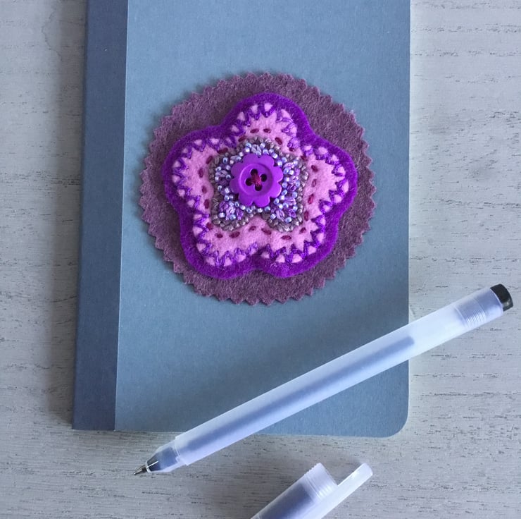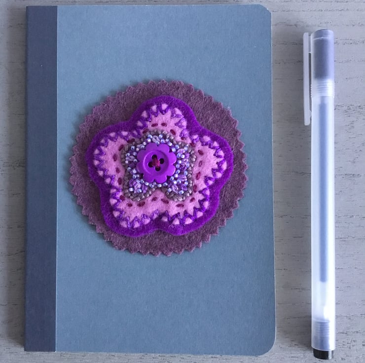 This Notebook and Pen Set has a hand embroidered disc of a felt flower in shades of purple with a purple flower button in the centre. This flower is hand embroidered with Fly and Lazy Daisy Stitches, dotted with small seed beads. This hand embroidered flower is on the notebook’s pale blue front cover.