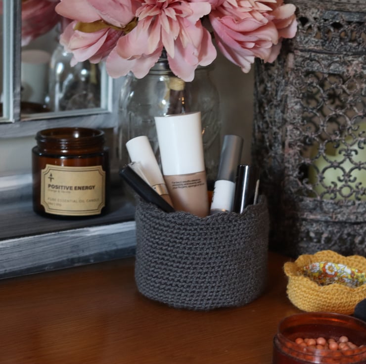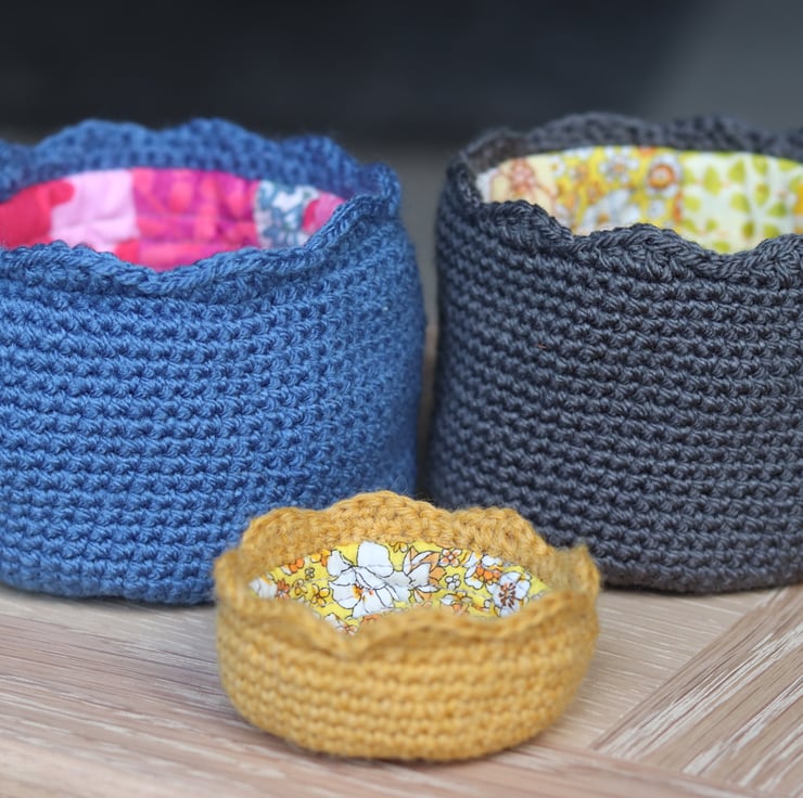 This soft crochet pot has a hand-quilted fabric lining and a scalloped edge, making it perfect for storing those smaller items on your desk, dressing table or workspace.