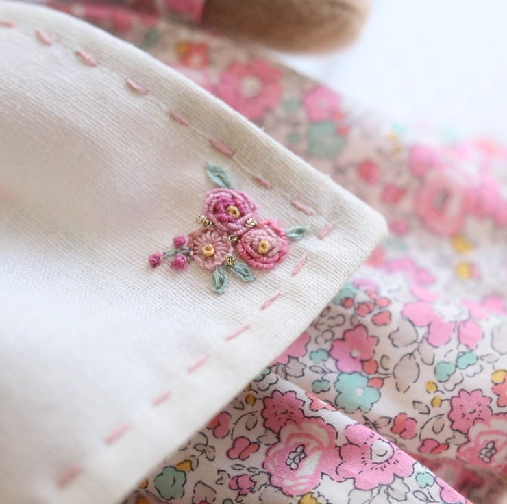 Her apron is made from cotton/linen fabric and embroidered with tiny running stitches and a sprig of flowers.
