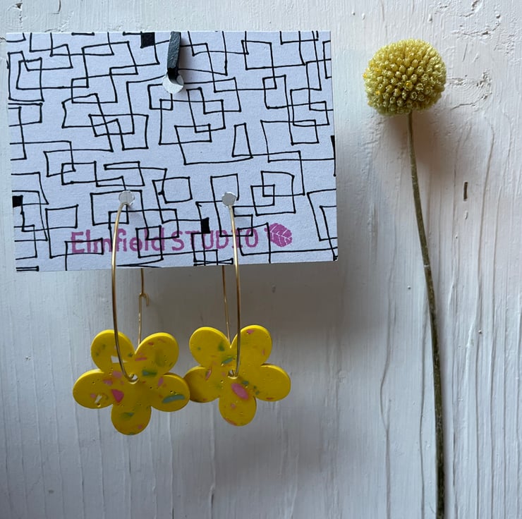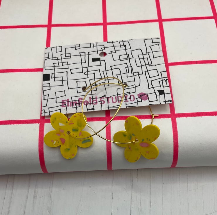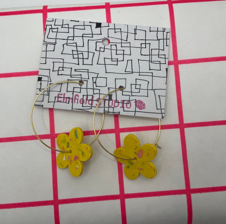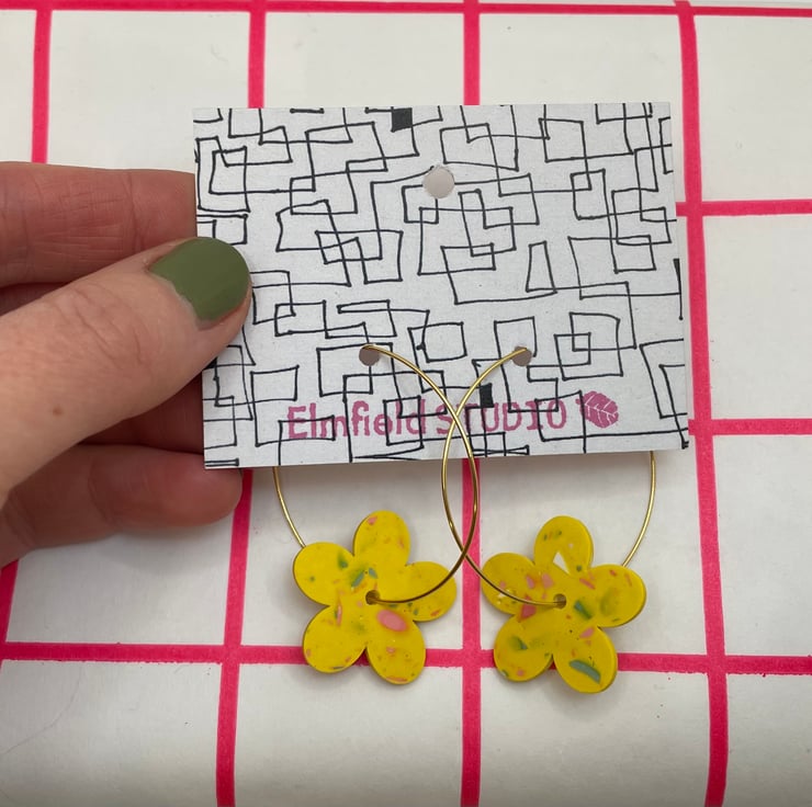 Colourful terrazzo flowers cast in Jesmonite finished on a gold plated 40mm hook latch hoop.