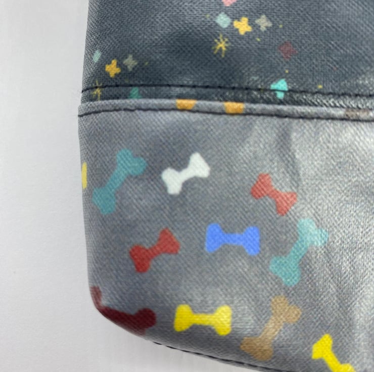 Crafted with care from eco-laminated 100% cotton, this holder is as sustainable as it is soft. The top boasts a delightful dark grey adorned with playful stars and dots, while the bottom features a lighter grey with bones. Inside is a light grey cotton fabric.