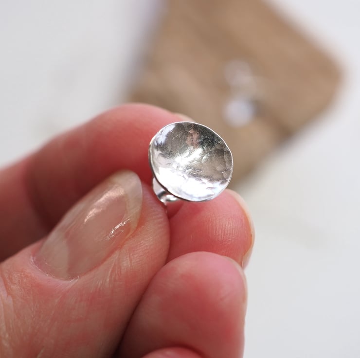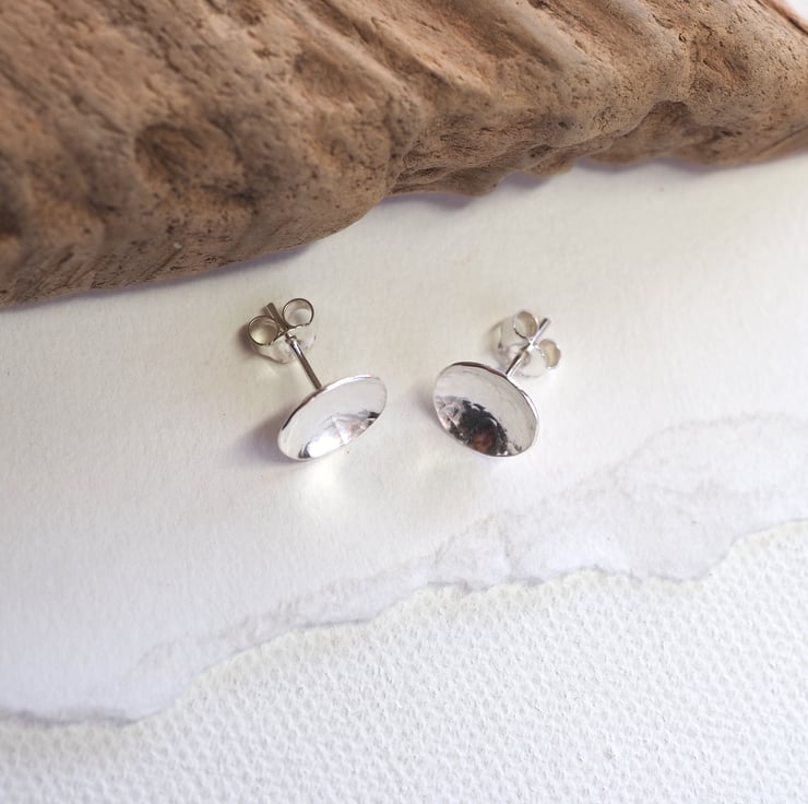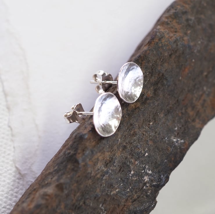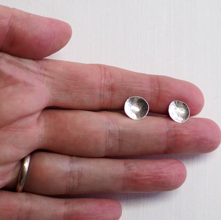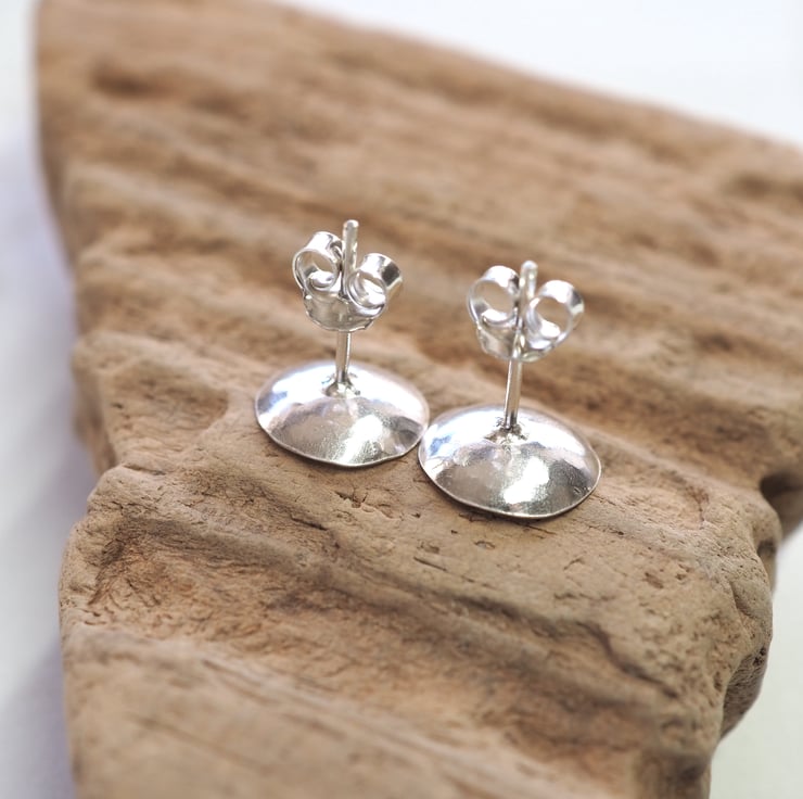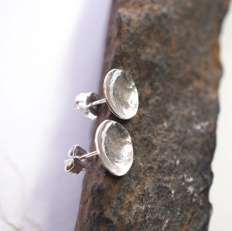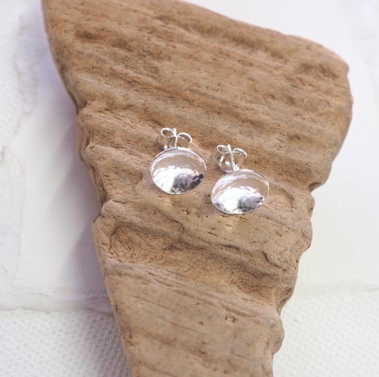 A simple and stylish pair of lightly hammered, round silver stud earrings. They have been domed to give a cupped shape and polished to a bright shine to finish. These studs make a great pair of unisex earrings for everyday wear.