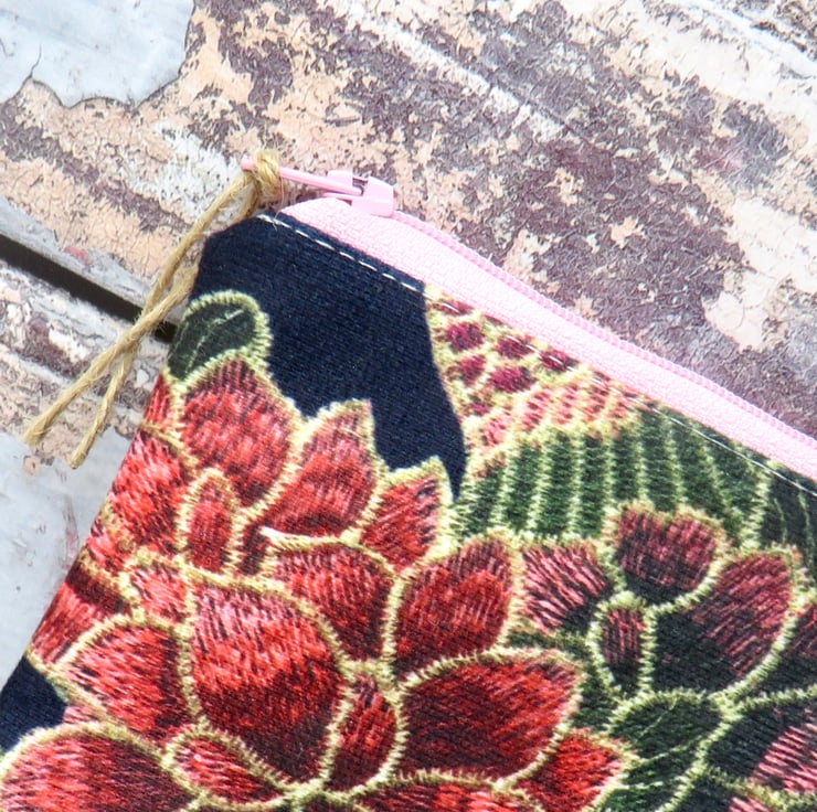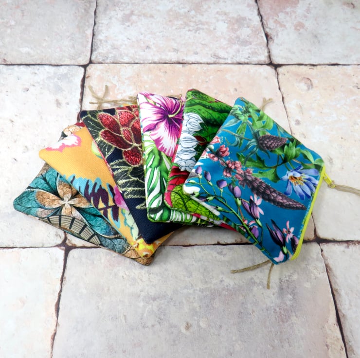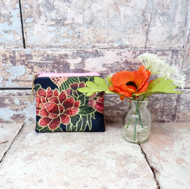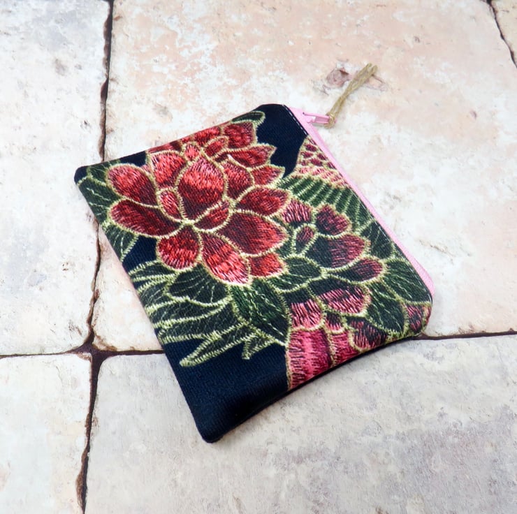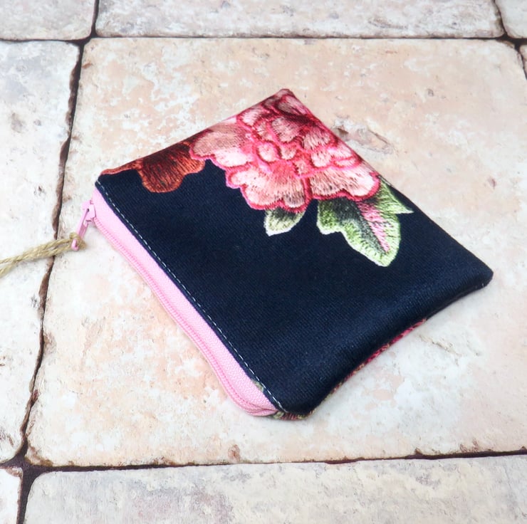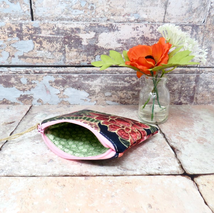 This pretty coin purse is handmade using a lovely velvety fabric. The black background features a floral motif in pink and green. It's lined in a green cotton print and closes with a pink zip. Approximate dimensions are 12 cm x 10 cm, making it large enough to hold your cash, cards, and keys. Perfect as a stocking filler or Secret Santa gift.