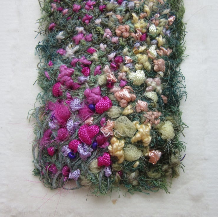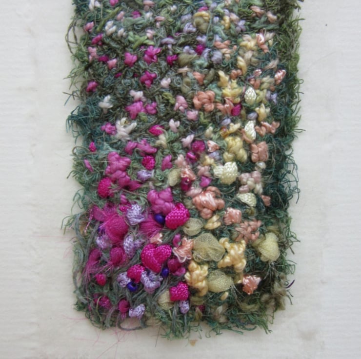 Hand stitched using many different threads a textile art picture in pink, lemon, mauve and green. This small embroidery gives an impressionistic view of a summer cottage garden. It is made using stitches and threads that overlay each other, building up to give a textural surface. Different threads have been used with a few tiny pink and mauve beads added to give highlights. The embroidery is layered onto a piece of handmade paper and then onto cream mountboard.