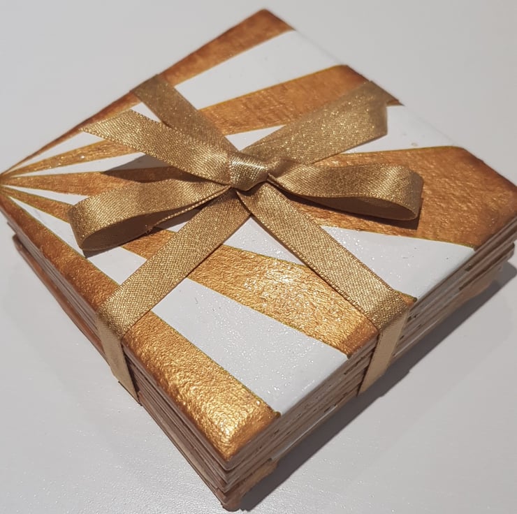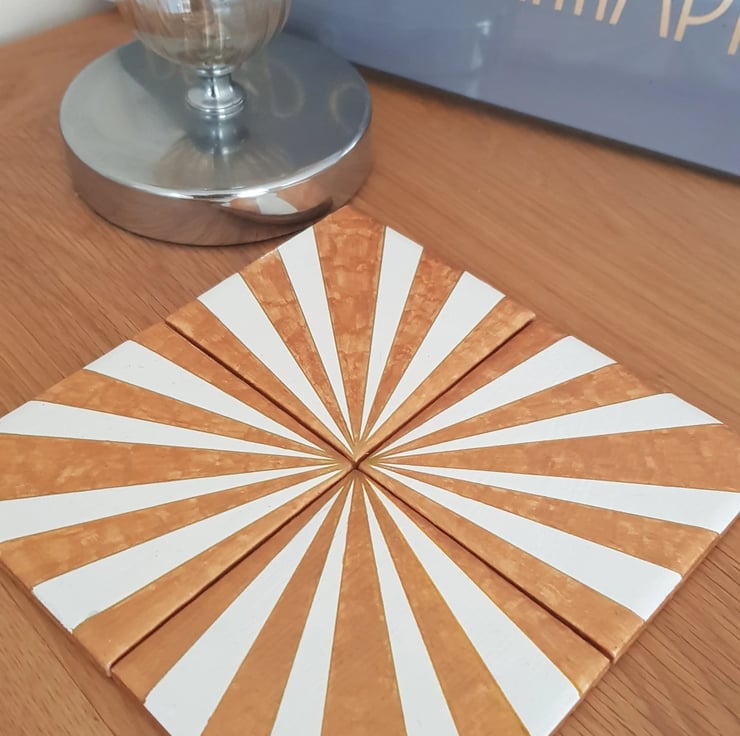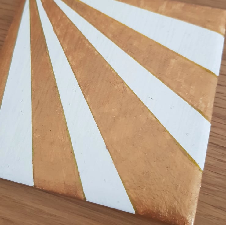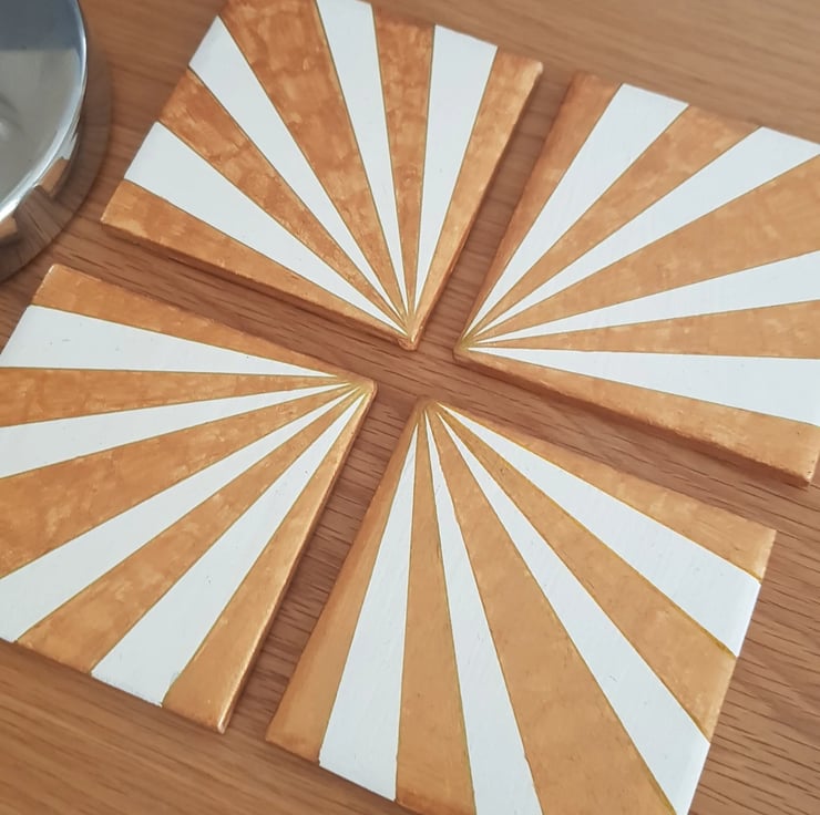 Set of 4 hand painted ceramic tile coasters in a gold and white art deco sunbeam design.