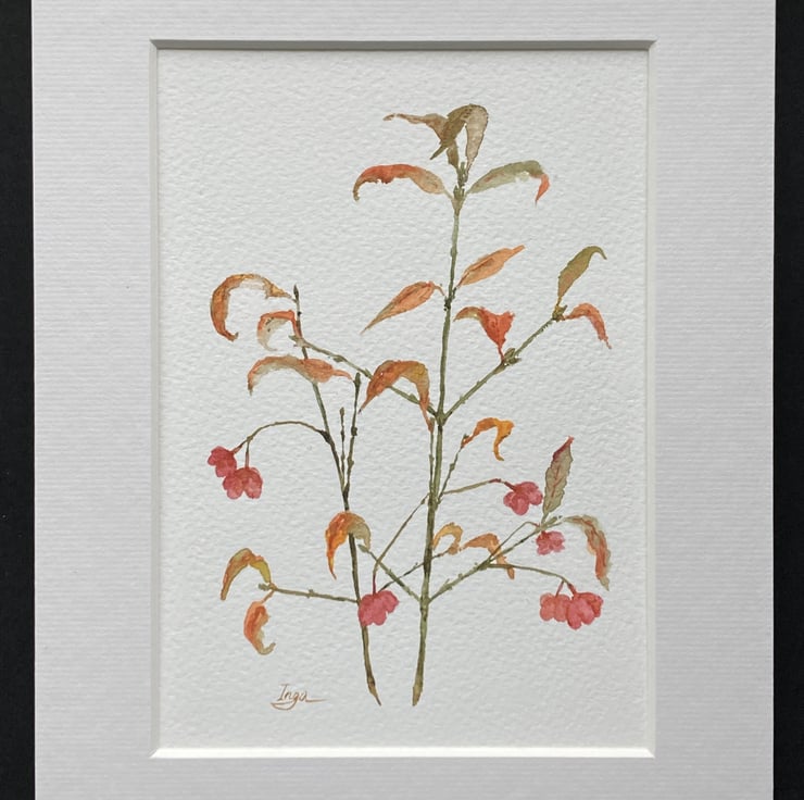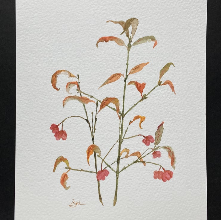 This is my original watercolour painting of ‘Branch of Spindle tree in the autumn’. It is a ‘one-of-a-kind’, unique item and is signed by me. It has been painted using quality paints onto an A5 cold pressed watercolour paper.