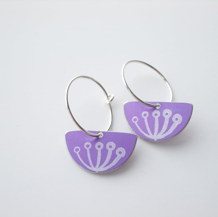 These cute little semi circle earrings are made from aluminium which I have a dyed in purple and printed with silver cow parsley prints. The dye is made permanent through heat and the colour becomes part of the metal. I cut out the semi circle shapes by hand using a jewellers saw and file the edges to give a nice finish. Finally I have hung them on 15mm sterling silver hoops. The semi circles measure approximately 17mm x 10mm.