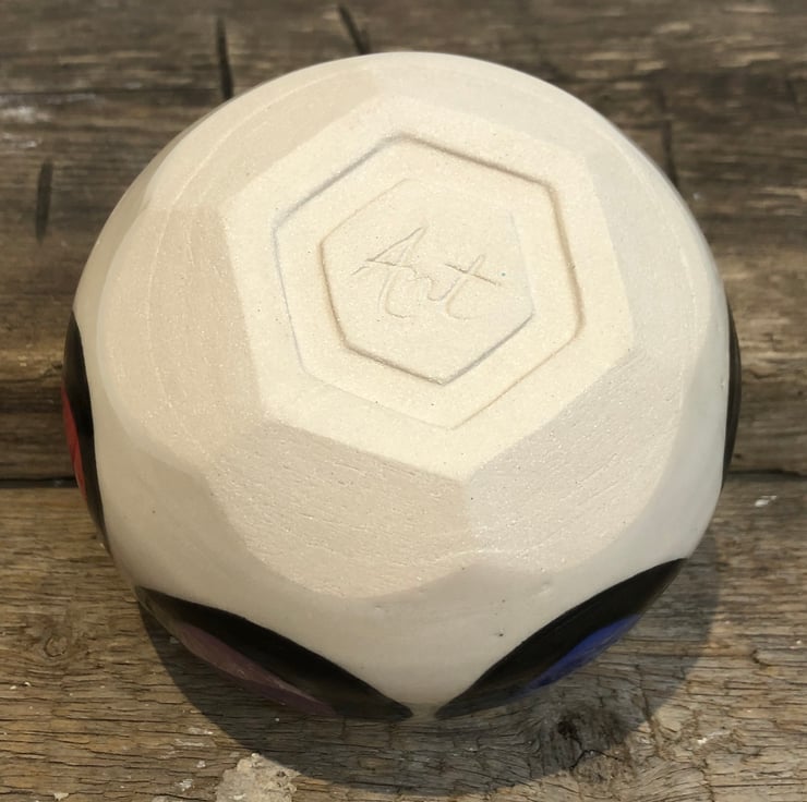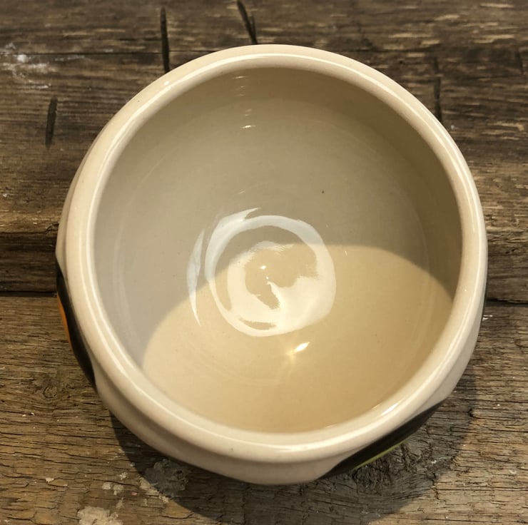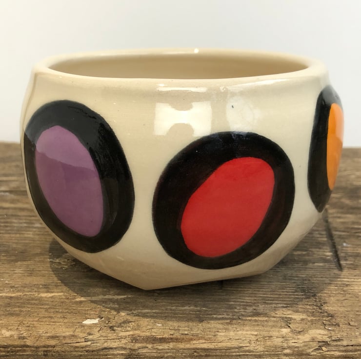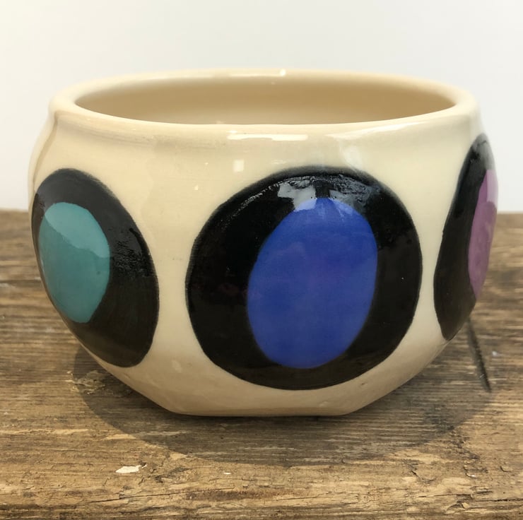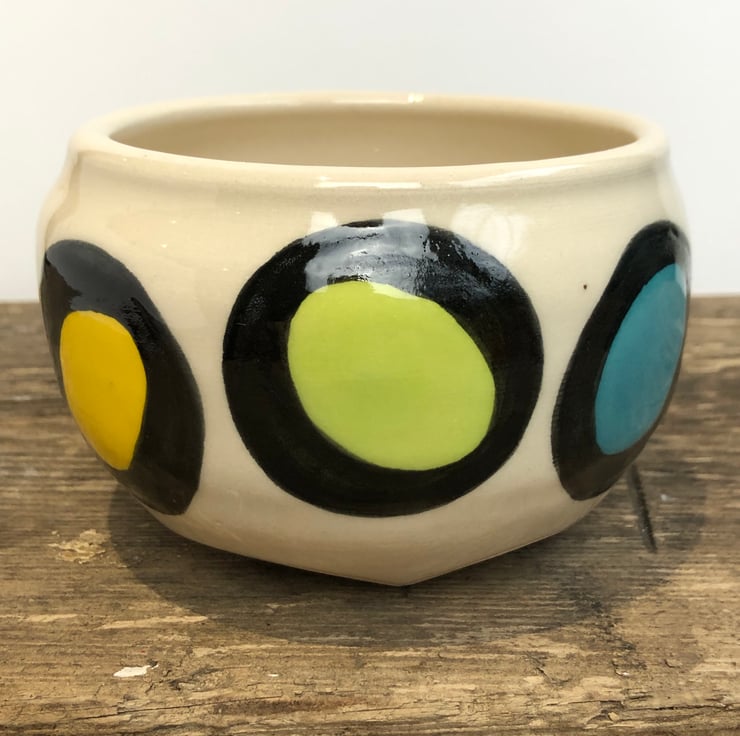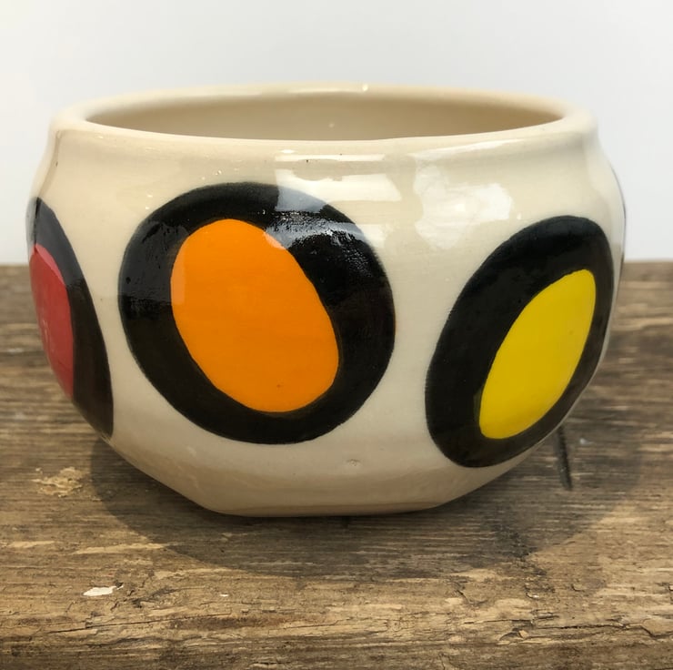 Thrown stoneware bowl decorated on the outside with hand-painted colourful spots and bold retro style black outlines. Bottom carved, signed and left unglazed.