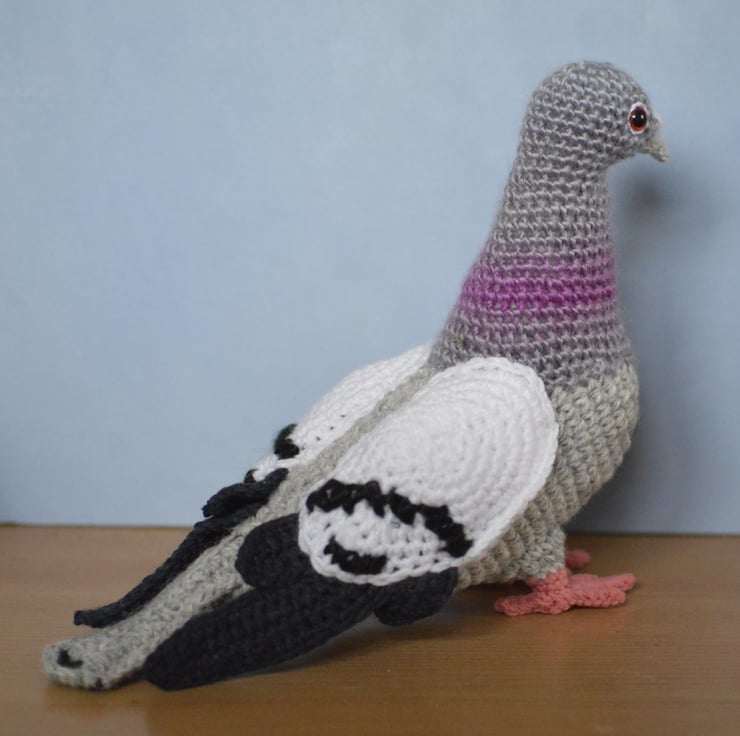 Using DK yarn for the head & Aran for the body makes a pigeon about 8 inches tall & 9 inches in length.The size is approximate as yarn can vary.