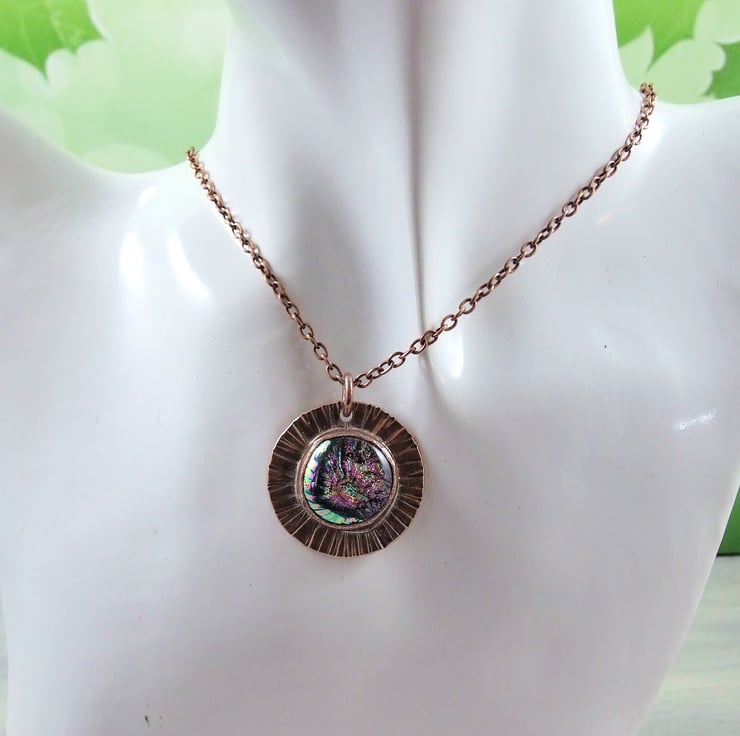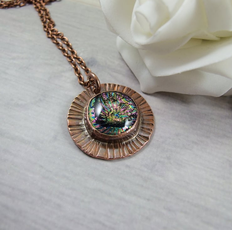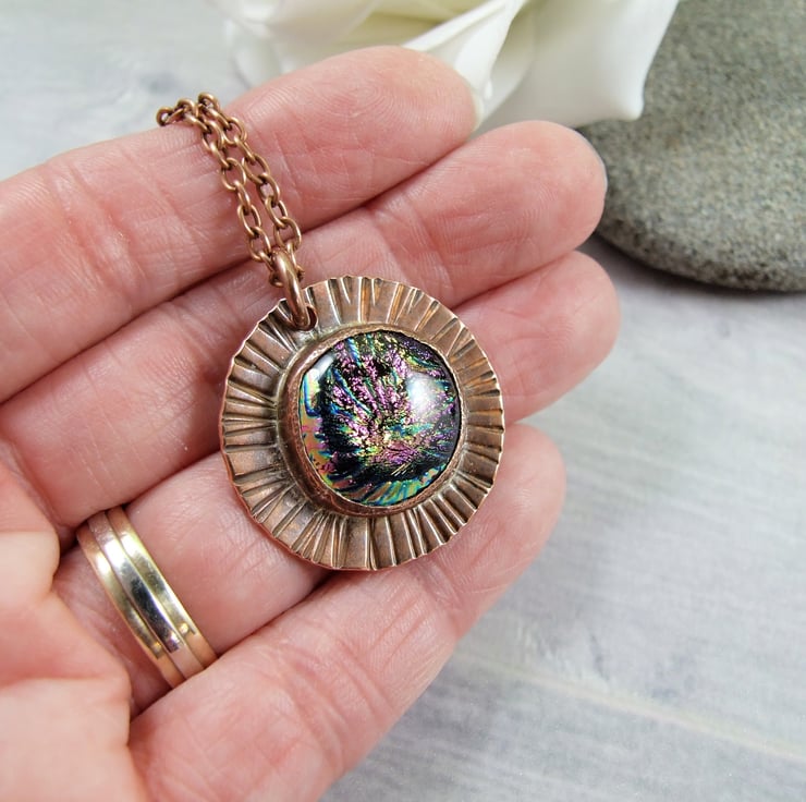 I began by making the dichroic glass cabachon first by layering different glass together with copper and then kiln firing where the glass reaches melting point and forms an organic domed shape. This process takes around 7 hours. Once the glass was ready I designed the copper bezel fitting and made it to fit the cabachon perfectly using copper sheet, wire and texturing the surrounding edges with a hand tool to create the starburst effect.