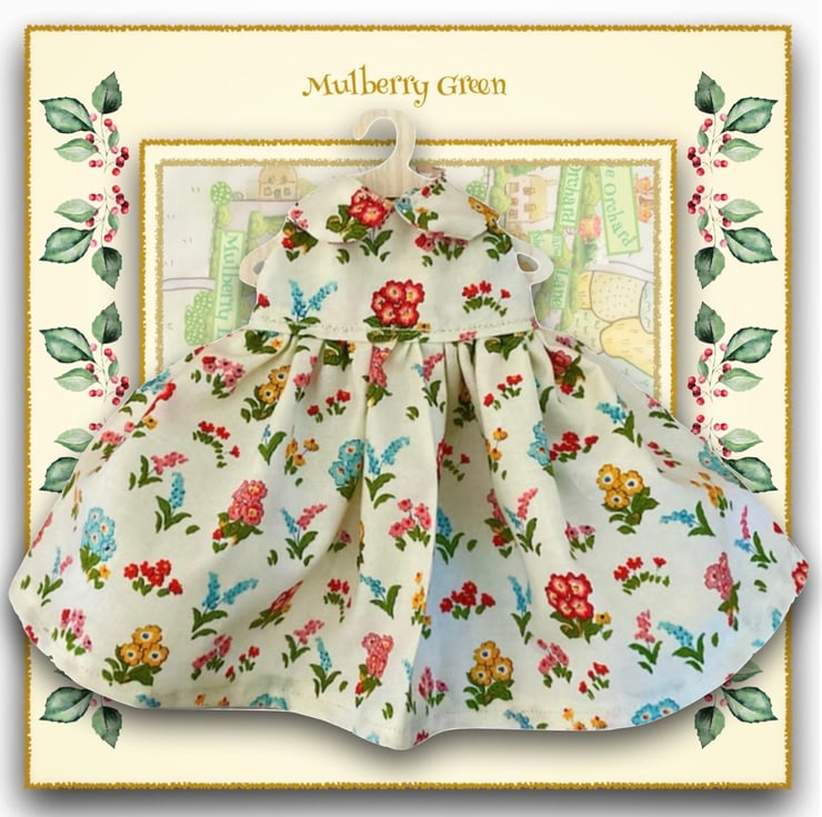 A pretty little dress in a Liberty floral print, to fit the Mulberry Green dolls. The dress is handmade from best quality cotton, has a lined bodice and fastens at the back with a little popper