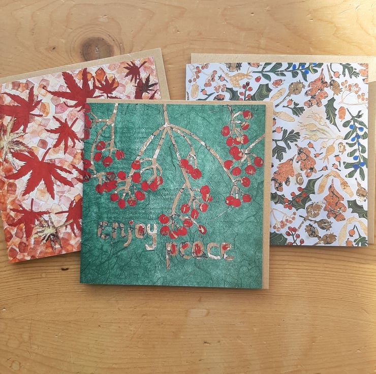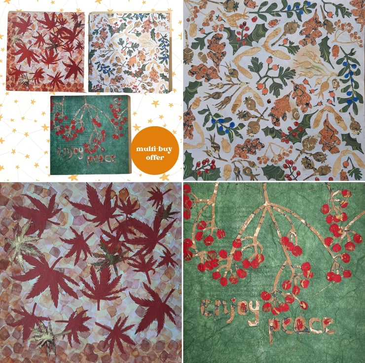 These designs feature marbled, tissue and painted papers. Each image is hand cut and carefully arranged.