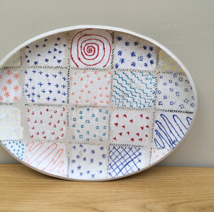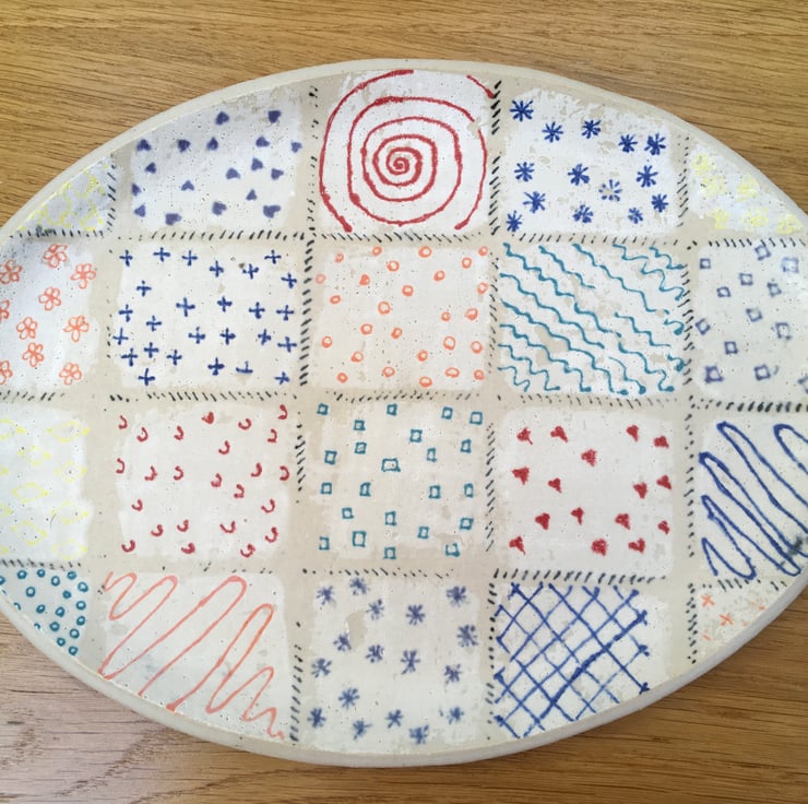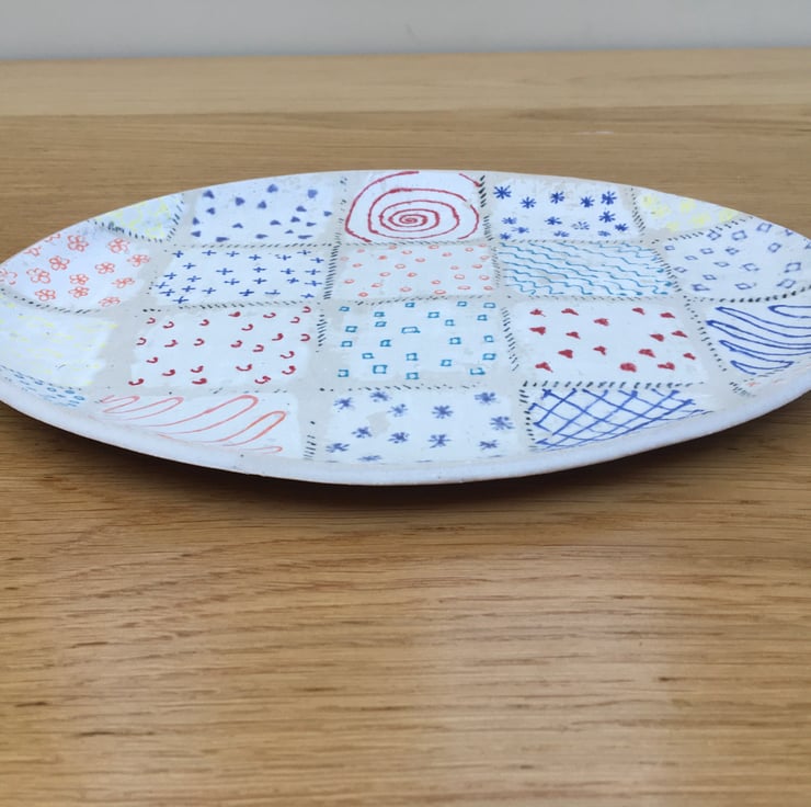 I wanted to try out a more ditsy pattern on a plate. The pattern turned out to be reminiscent of a patchwork quilt.