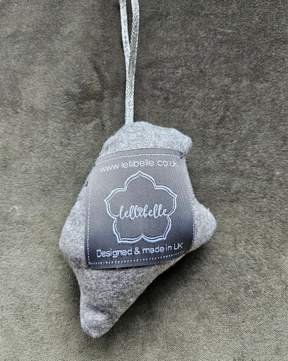 This handmade hanging Robin Christmas decoration is made using a grey wool fabric, with a fabric applique and freehand machine embroidered robin design on the front.
