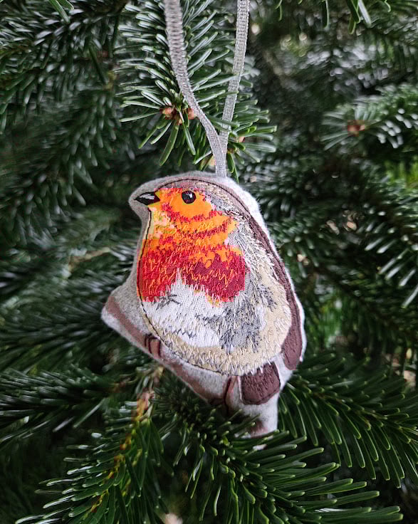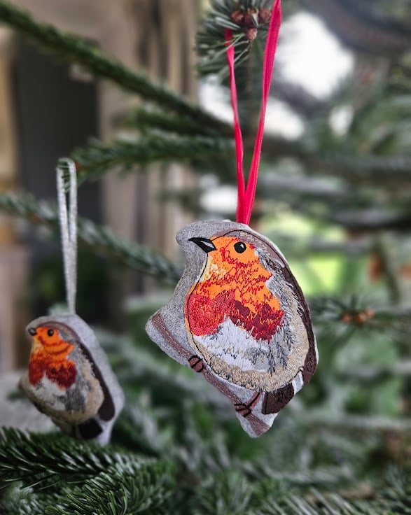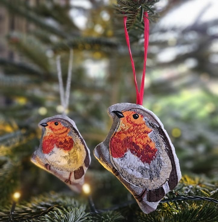 These handmade fabric Christmas decorations feature my popular robin embroidery.