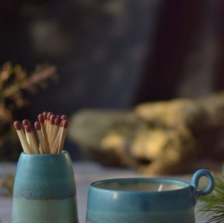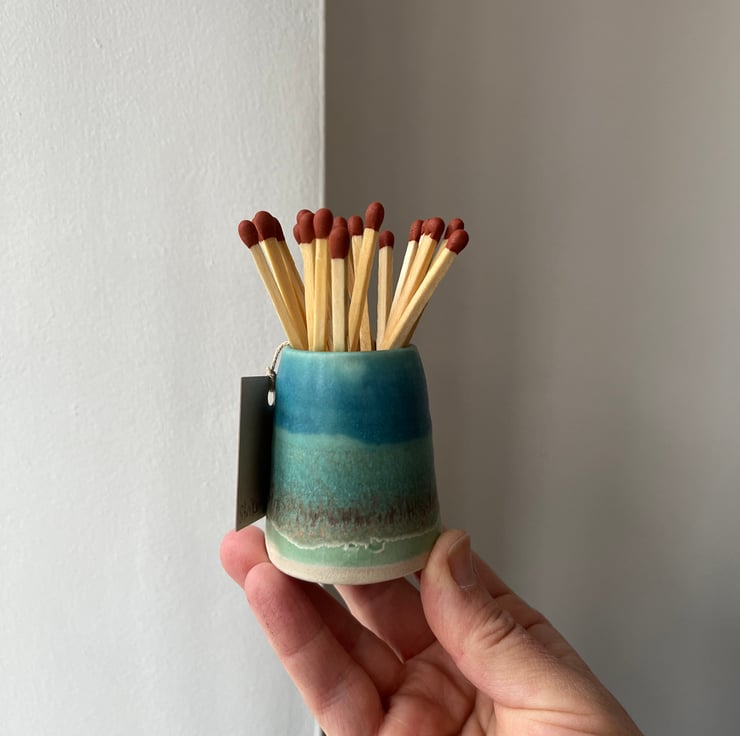 A small handmade pot that comes complete with a set of long matchsticks and has striker paper on it's base.