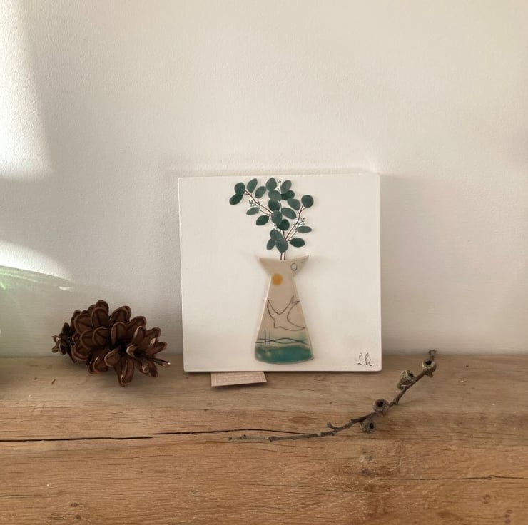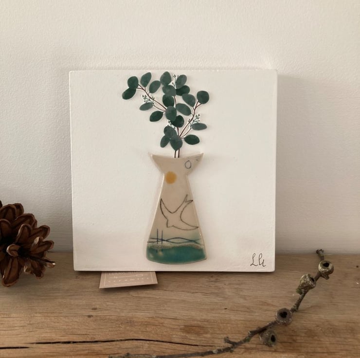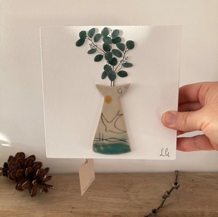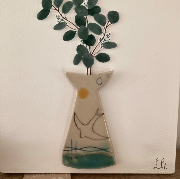 A wall plaque to bring the outside in. A ceramic pot featuring a swift with foliage set on a wooden block ready to hang on your wall. This is a collaborative piece made with the designer Rebecca Spikings Design who has designed and made the foliage.