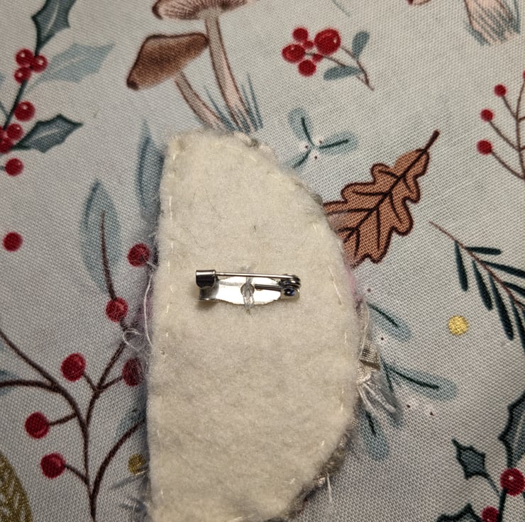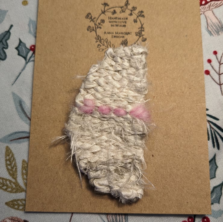 A unique, individually designed and hand woven brooch. Created using beautiful natural materials, including wool and recycled silk sari ribbon. Colours include white, silvery-grey and pink. Finished by hand stitching a felt back onto the woven piece and adding a metal brooch clasp.